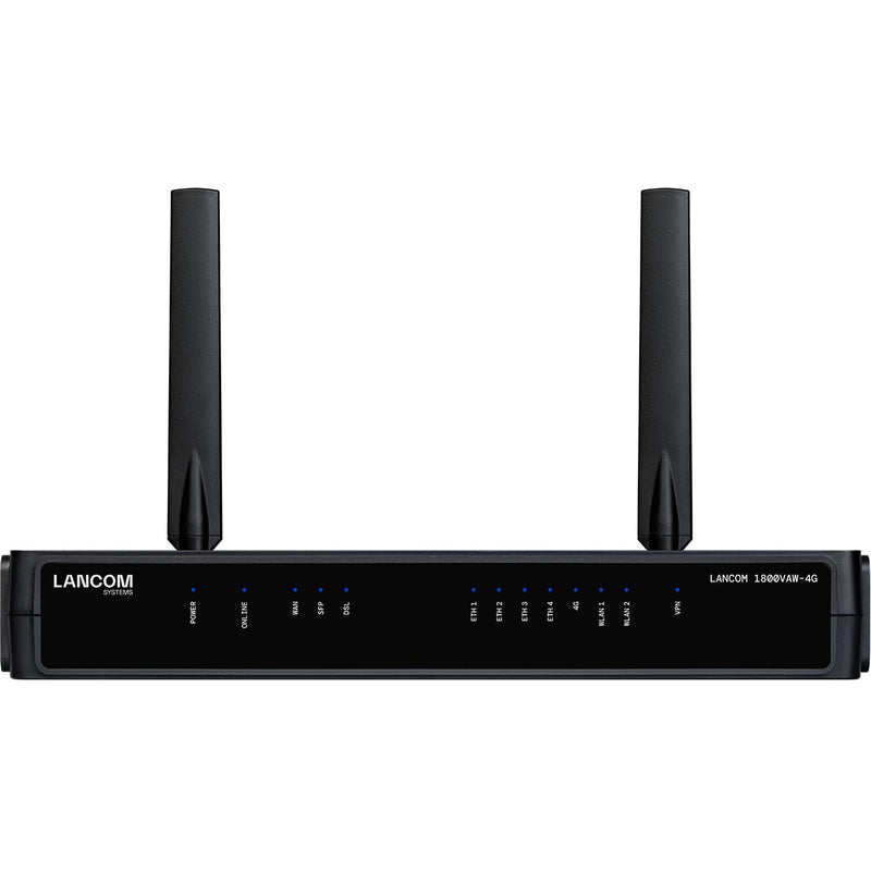 LANCOM 1800VAW-4G (EU). Produktfarbe: Schwarz. LED-Anzeigen: DSL. LAN. Leistung. WAN. WLAN. Anzahl Lüfter: 1 Lüfter. Antennentyp: Extern. Antenne Steckertyp: SMA. Antenne Zunahmeniveau (max): 2 dBi. Unterstützte Netzwerkprotokolle: DNS. HTTP. HTTPS. ICMP. NTP/SNTP. NetBIOS. PPPoE (server). RADIUS. RADSEC (secure RADIUS). RTP..... Router Protokoll: BGP4. LISP. OSPFv2. RIP-2. VRRP. Ethernet LAN Datentransferraten: 10.100.1000 Mbit/s. Netzstandard: IEEE 802.11a. IEEE 802.11ac. IEEE 802.11ax. IEEE 802.11b. IEEE 802.11d. IEEE 802.11g. IEEE.... Datenübertragungsgeschwindigkeit WLAN: 1.2.5.5.6.9.11.18.24.36.54.300.574.867.1200 Mbit/s. Unterstützte Sicherheitsalgorithmen: 802.1x RADIUS. AES-CCMP. AES-GCMP. EAP-FAST. EAP-GTC. EAP-MD5. EAP-TLS. EAP-TTLS. MSCHAPv2. TKIP..... Authentisierung Methode: PAP. CHAP. MS-CHAP. MS-CHAPv2