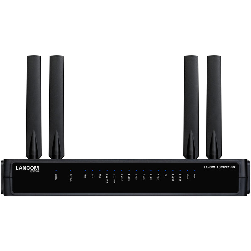 LANCOM 1803VAW-5G (EU). Produktfarbe: Schwarz. Befestigungstyp: Tisch-/Wandmontage. Anzahl Lüfter: 1 Lüfter. Antennentyp: Extern. VoIP Protokolle: RTP. SIPS. SRTP. Ethernet LAN Datentransferraten: 10.100.1000 Mbit/s. Netzstandard: IEEE 802.11a. IEEE 802.11ac. IEEE 802.11ax. IEEE 802.11b. IEEE 802.11g. IEEE 802.11n. Mobilfunknetzgenerierung: 5G. Unterstützte Sicherheitsalgorithmen: AES-CCMP. AES-GCMP. EAP-TLS. EAP-TTLS. SNMP. SNMPv2. SNMPv3. TKIP