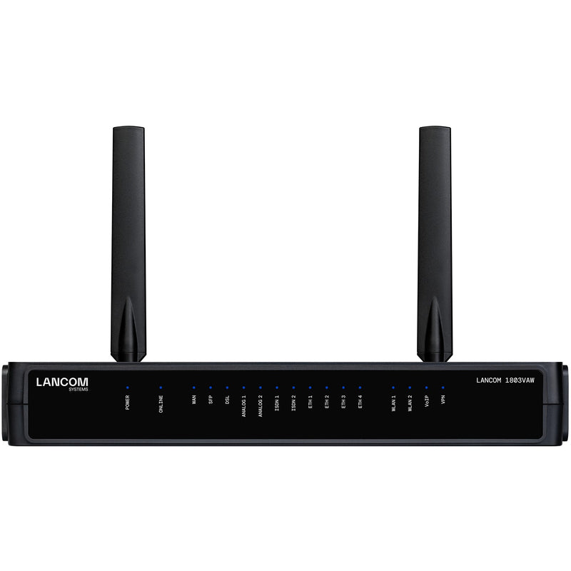 LANCOM 1803VAW (EU). Produktfarbe: Schwarz. Anzahl Lüfter: 1 Lüfter. Antennentyp: Extern. Antenne Steckertyp: SMA. Antenne Zunahmeniveau (max): 2 dBi. Management-Protokolle: SNMPv1.v2c.v3. Unterstützte Netzwerkprotokolle: Ethernet over GRE-Tunnel (EoGRE). L2TPv3. ARP-Lookup. LLDP. DHCP option 82..... VoIP Protokolle: SIP ALG. Ethernet LAN Datentransferraten: 10.100.1000 Mbit/s. Netzstandard: IEEE 802.1Q. IEEE 802.3az. Frequenzband: 2.4/5 GHz. Unterstützte Sicherheitsalgorithmen: 3DES. AES. FIPS 140. SHA-1. SHA-256. SHA-384. SHA-512. Authentisierung Methode: PAP. CHAP. MS-CHAP. MS-CHAPv2