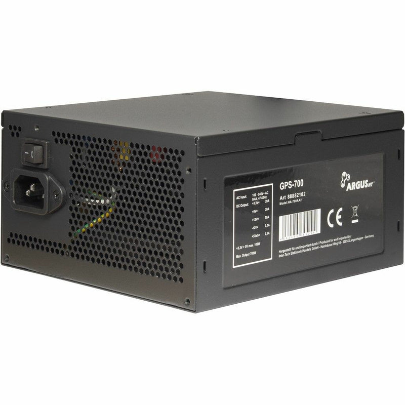 Inter-Tech ArgusNT GPS-700. Gesamtleistung: 700 W. AC Eingangsspannung: 100 - 240 V. AC Eingangsfrequenz: 47 - 63 Hz. Motherboard Anschlussstecker: 20+4 pin ATX. Kabeltyp: Nicht-modular. Zweck: PC. Stromversorgungseinheit (PSU) Formfaktor: ATX. 80 Plus Zertifizierung: 80 PLUS Gold. Produktfarbe: Schwarz. Lüfterdurchmesser: 14 cm. Anzahl Lüfter: 1 Lüfter. Mitgelieferte Kabel: AC