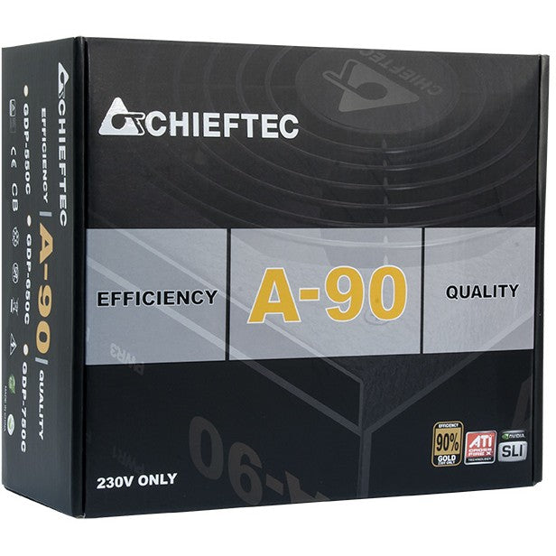 Chieftec GDP-750C. Gesamtleistung: 750 W. AC Eingangsspannung: 200 - 240 V. AC Eingangsfrequenz: 47 - 63 Hz. Motherboard Anschlussstecker: 20+4 pin ATX. Kabeltyp: Semi-Modular. Zweck: PC. Stromversorgungseinheit (PSU) Formfaktor: PS/2. Produktfarbe: Schwarz. Lüfterdurchmesser: 14 cm. Anzahl Lüfter: 1 Lüfter. Breite: 160 mm. Tiefe: 150 mm. Höhe: 87 mm