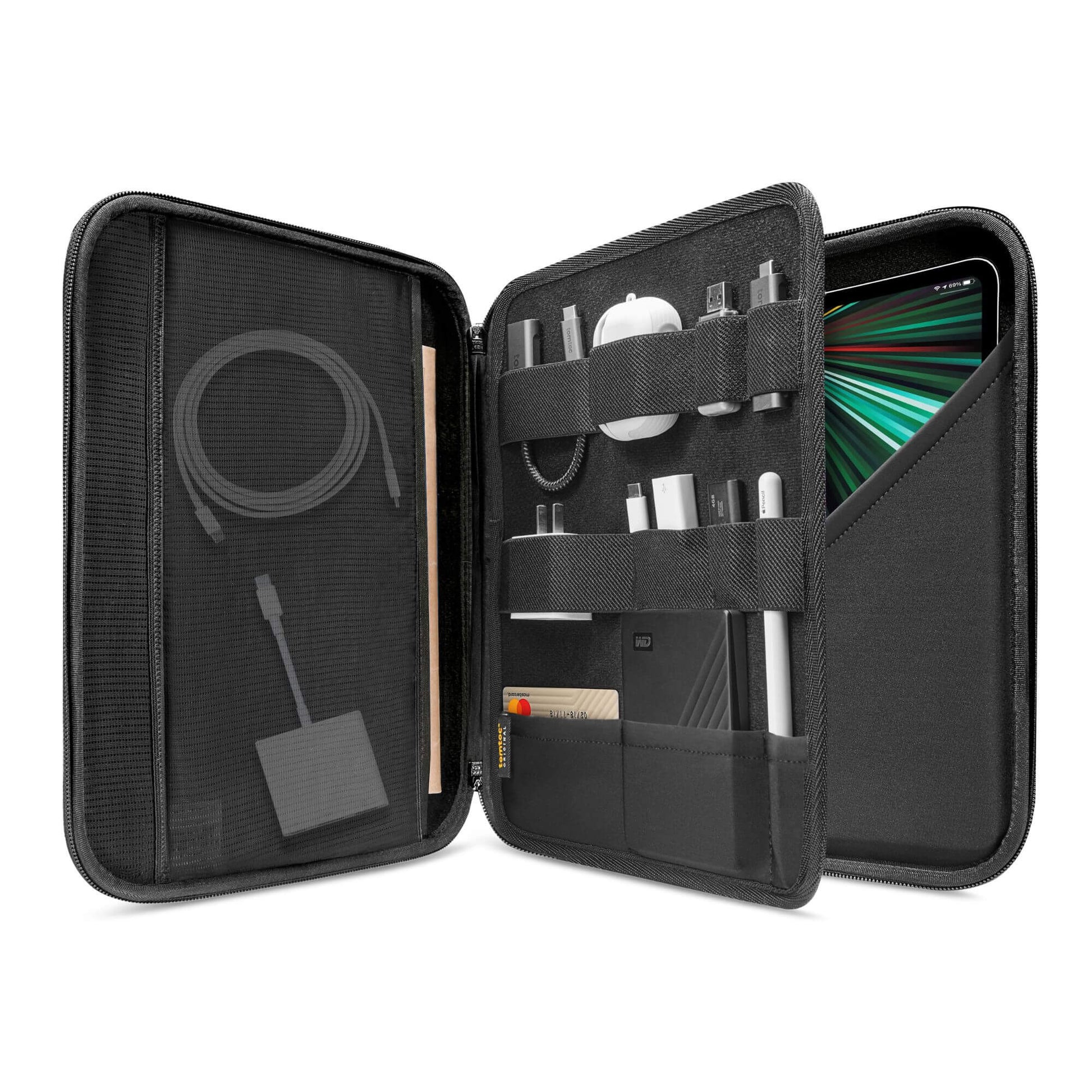 Im Inneren des Cases trennt eine spezielle Abdeckung Ihr Tablet von anderem Zubehör, sodass Kabel, Adapter, Stifte, Visitenkarten und Notizen ordentlich verstaut werden können. Dank flexibler Gummibänder bleibt der Inhalt sicher an seinem Platz und verrutscht nicht. Patentierte Bauteile wie die EVA-Hartschalen sowie die robusten Reißverschlüsse bieten zusätzlichen Schutz vor äußeren Krafteinwirkungen und verhindern ein Herausrutschen des Tablets.