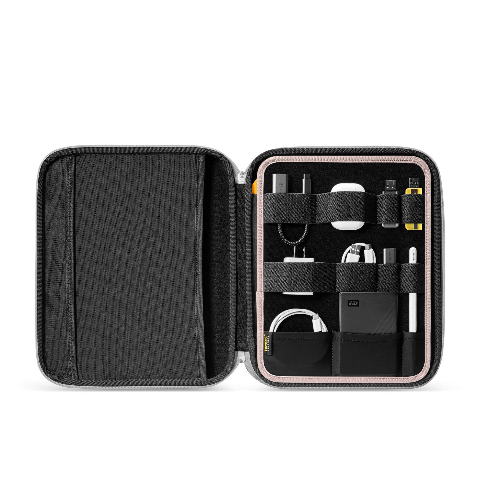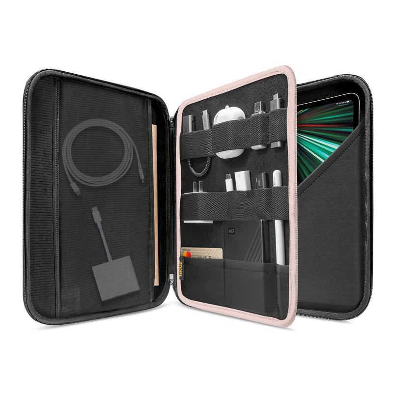 Im Inneren des A06 Case trennt eine praktische Abdeckung Ihr Tablet vom Zubehör. Hier finden Kabel, Adapter, Stifte, Visitenkarten, Kreditkarten und sogar Notizzettel ausreichend Platz. Mit elastischen Gummibändern wird der Inhalt sicher fixiert, sodass nichts verrutscht. Die patentierten Bauteile, darunter EVA-Hartschalen, ein stabiler Tragegriff und robuste Reißverschlüsse, schützen Ihr Gerät vor äußeren Einflüssen und verhindern ein Herausrutschen aus der Hülle.