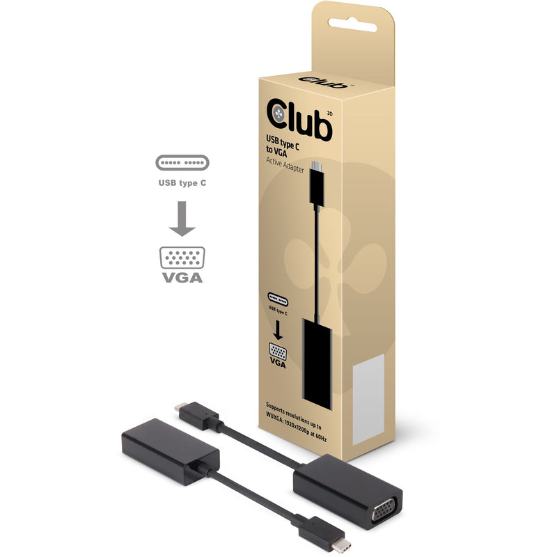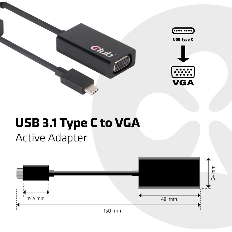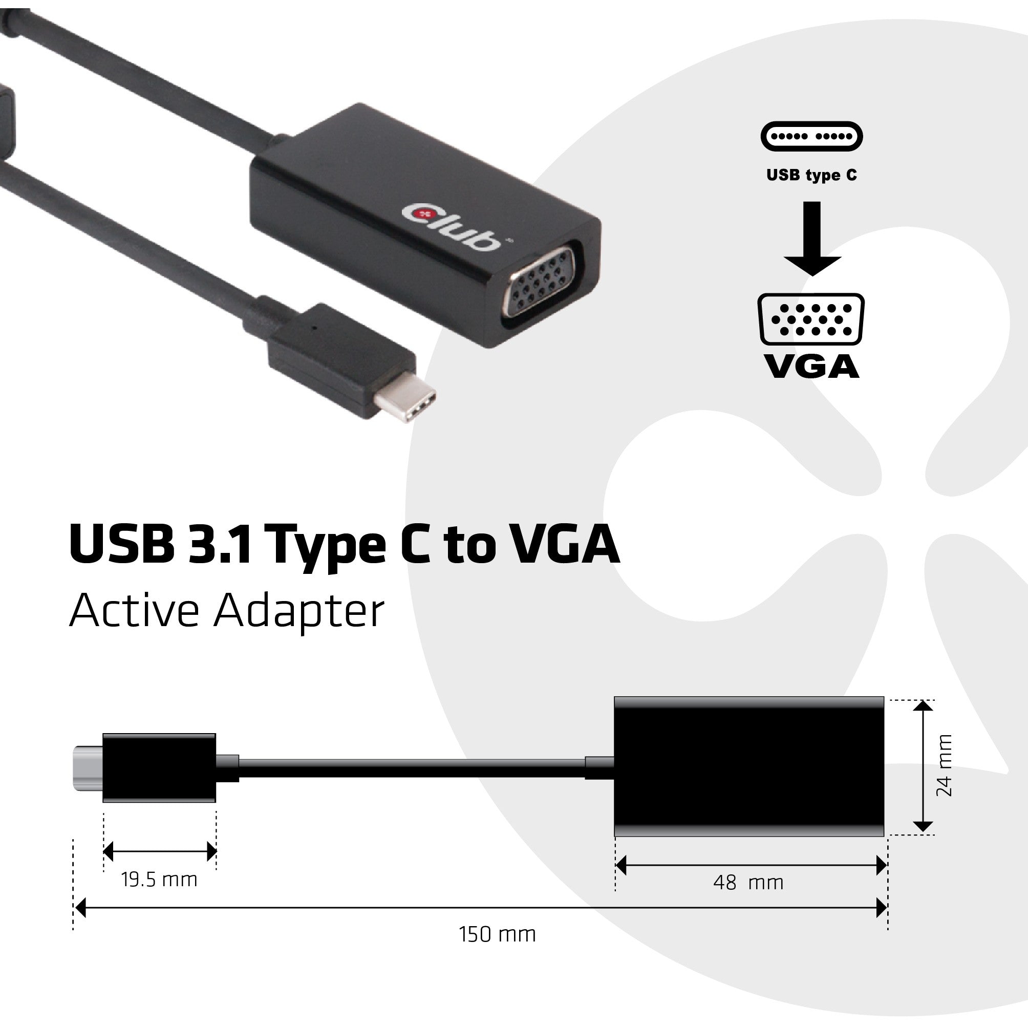 CLUB3D USB 3.1 Type C to VGA Active Adapter. Anschluss 1: USB C. Anschluss 2: VGA. Kabellänge: 0.15 m. Beschichtung Steckerkontakte: Gold. Produktfarbe: Schwarz