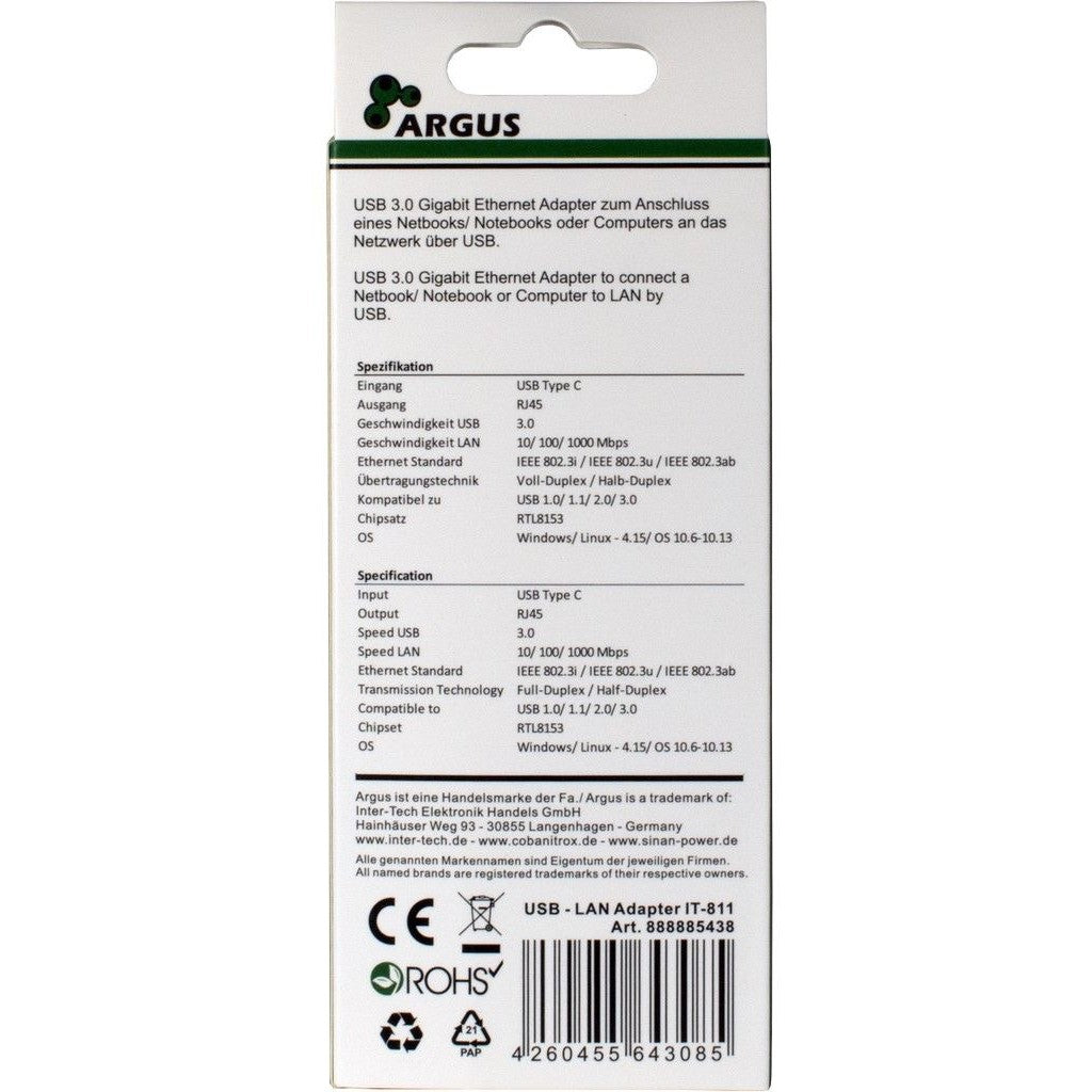 Inter-Tech ARGUS IT-811. Produktfarbe: Schwarz. Chipsatz: Realtek RTL8153. Breite: 25 mm. Tiefe: 230 mm. Höhe: 17 mm. Paketgewicht: 45 g. Kompatible Betriebssysteme: Windows 7. 8. 8.1. 10. Linux Mac 10.6. Netzstandard: IEEE 802.3ab. IEEE 802.3i. IEEE 802.3u
