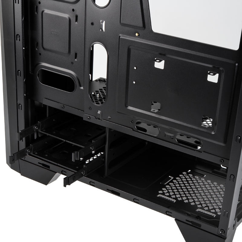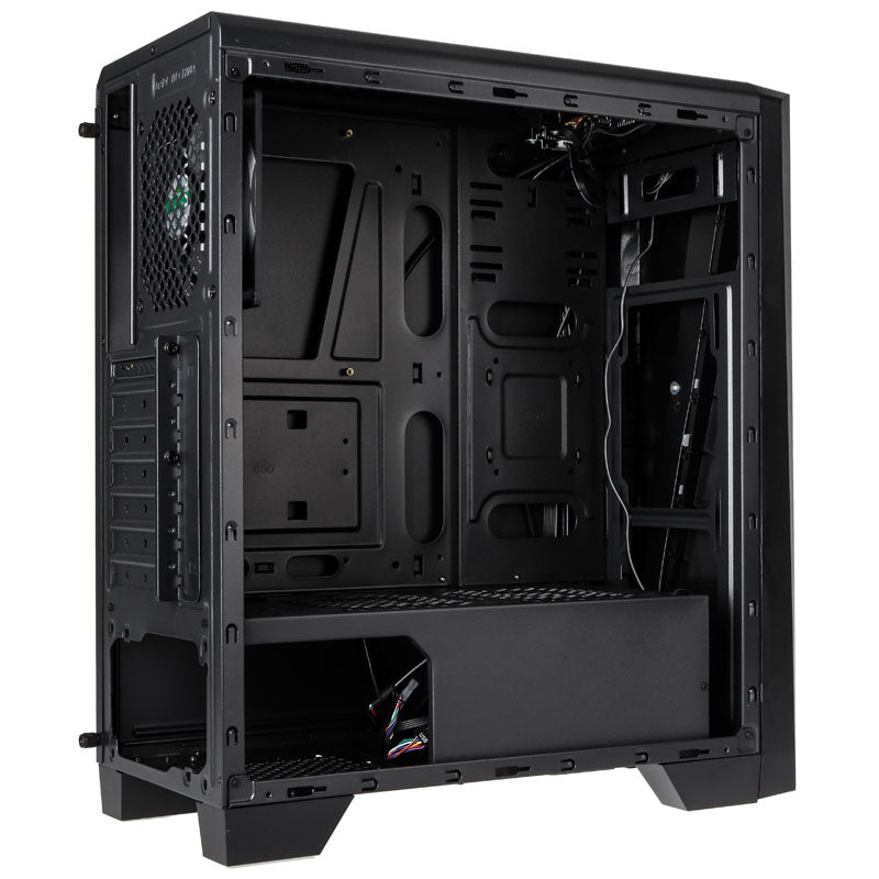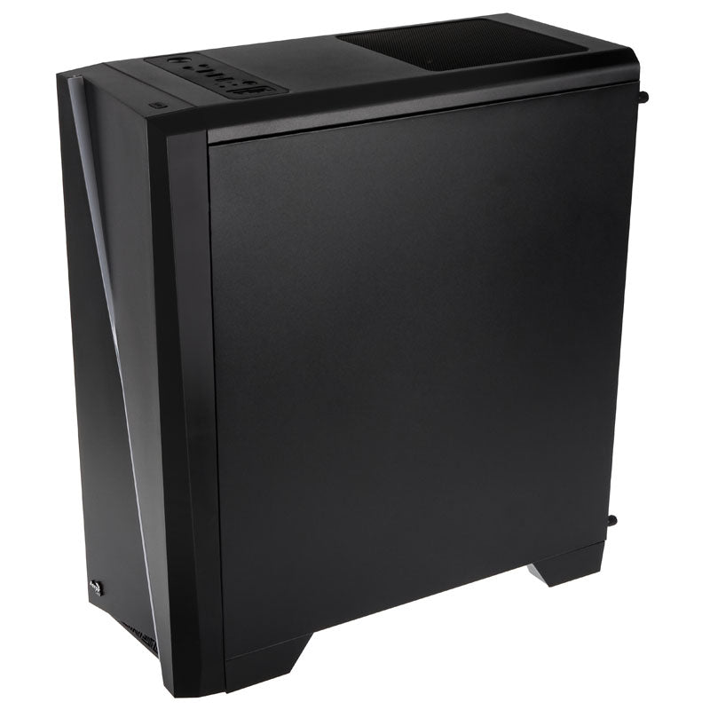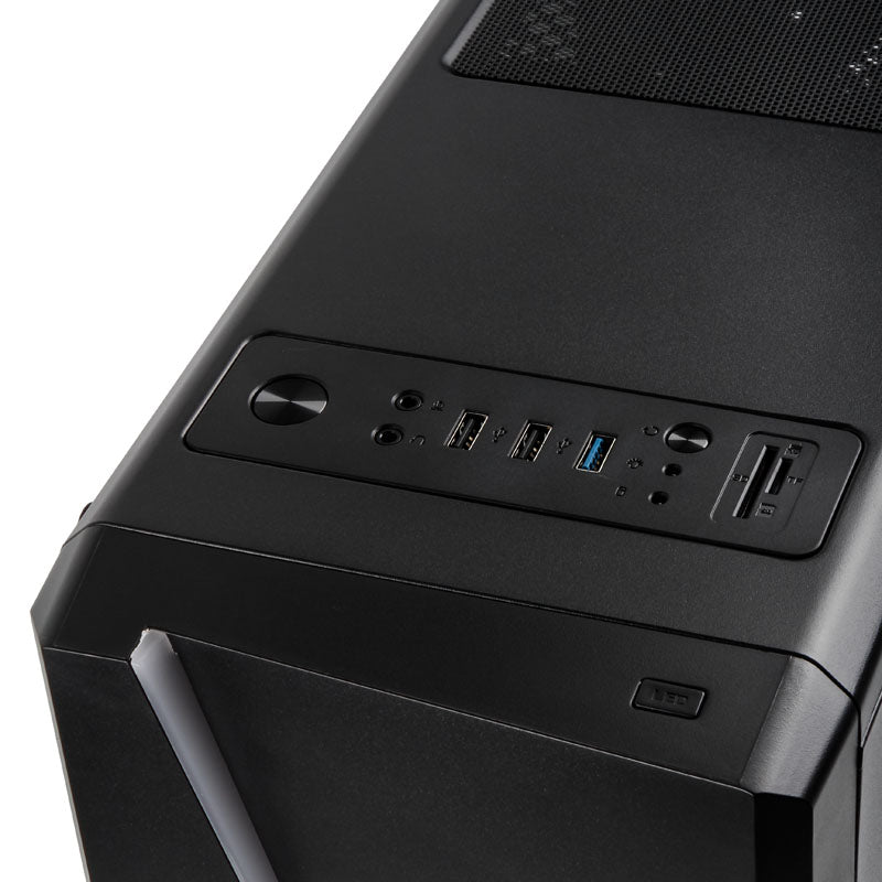 Kompakter Midi-Tower in Schwarz, Seitenteil aus Acrylglas, stylische RGB-Beleuchtung an der Frontseite, SD- und MicroSD-Karteneinschub im I/O-Panel, bis 7x 120-mm-Lüfter, Support für VGAs bis 37 cm und Kühler bis 15,5 cm, 2x 2,5/3,5 & 2x 2,5 Zoll, 3x USB