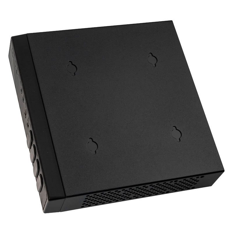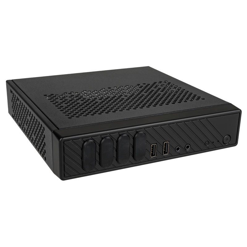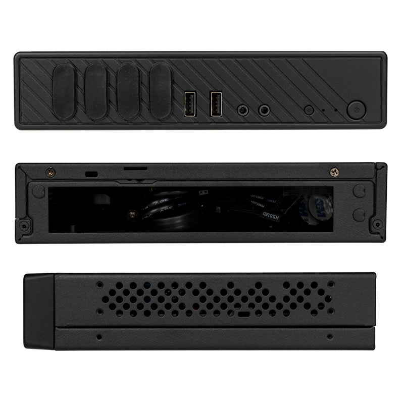 Kompaktes Thin-Mini-ITX-Gehäuse von Akasa, 1x 2,5-Zoll HDD/SSD, Vorbereitungen für 4x Serial Port, 2x USB 2.0 Typ A-Buchse, 2x 3,5-mm-Audio-Buchse, VESA-kompatibel