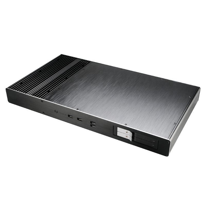Ultrakompaktes Thin-Mini-ITX-Gehäuse, aus schwarzem Aluminium gefertigt, OEM-Version ohne Logo, extrem flach & passiv kühlend, zwei 2,5-Zoll-Slots, je zwei USB-3.0/2.0-Ports