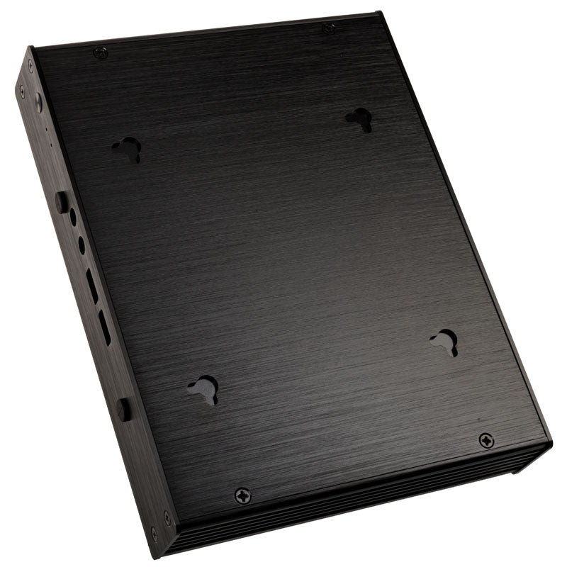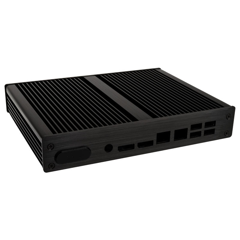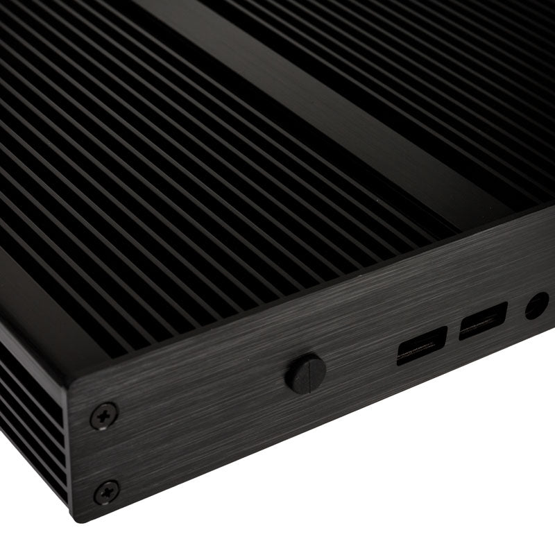 Kompaktes Gehäuse für Fujitsu D3544-S Thin STX Mainboards, Lüfterlose Kühlung durch passives Gehäusedesign mit großen Finnen, Edler Look durch gebürstetes Aluminium in schwarz, 2x USB 3.0-Ports und 2x Audio In/Out in der Front, VESA-kompatibel