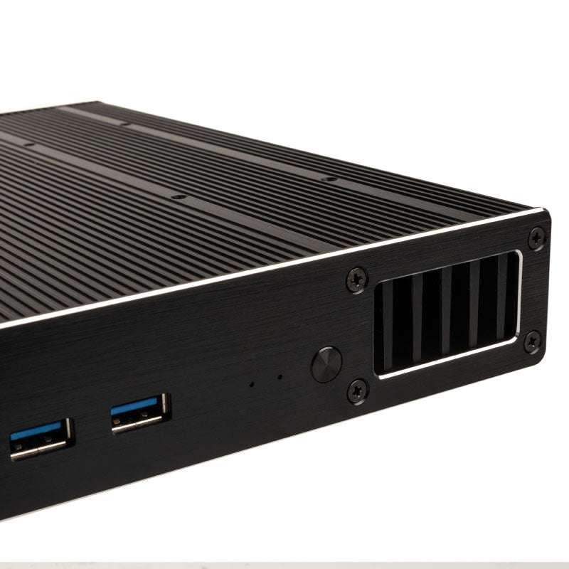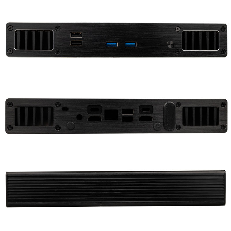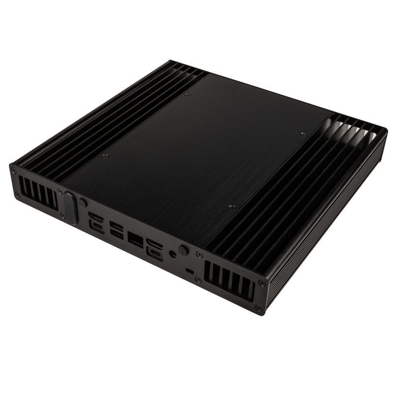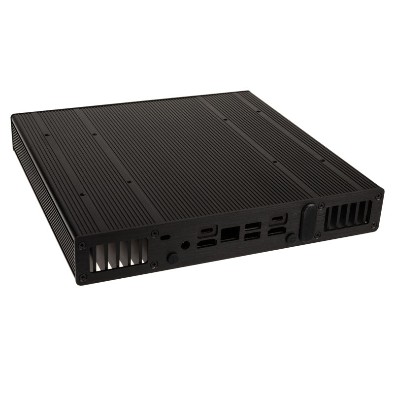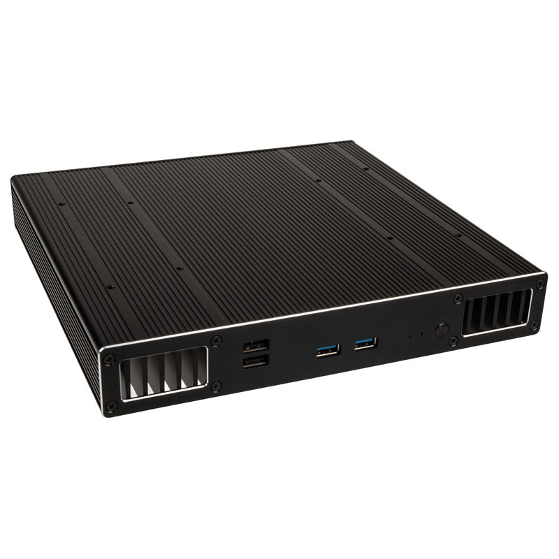 Kompaktes Gehäuse für UCFF-Boards (Intel NUC), lüfterlose Kühlung durch passives Gehäusedesign, große Kühlfinnen, gebürstetes Aluminium in schwarz, Front mit 2x USB-3.0- und 2x USB-2.0-Ports, Platz für 1x 2,5-Zoll-Datenträger, VESA-kompatibel