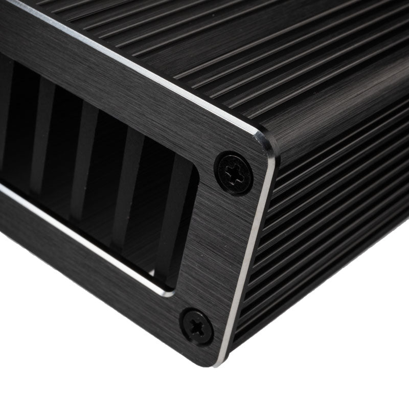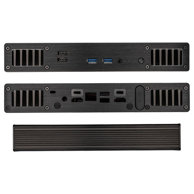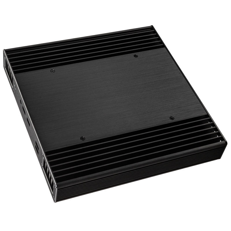 Kompaktes Gehäuse für UCFF-Boards (Intel NUC), für Intel NUC Pro 11. bis 13. Gen, lüfterlose Kühlung durch passives Gehäusedesign, gebürstetes Aluminium in Schwarz, Front mit 2x USB-3.0- und 2x USB-2.0-Ports, Platz für 1x 2,5-Zoll-Datenträger, VESA-kompatibel