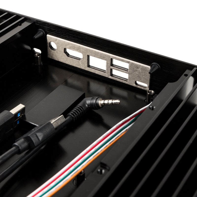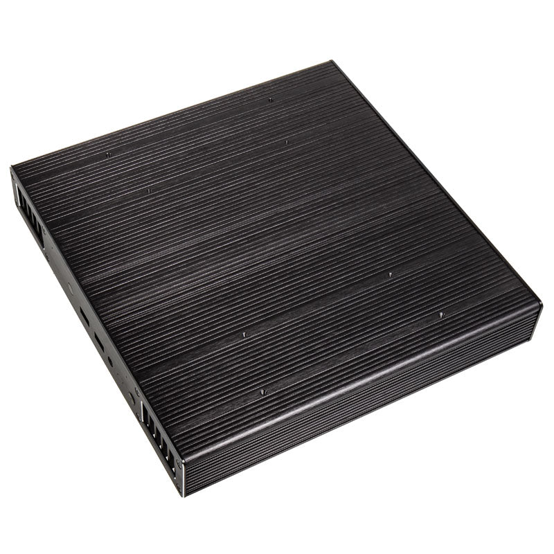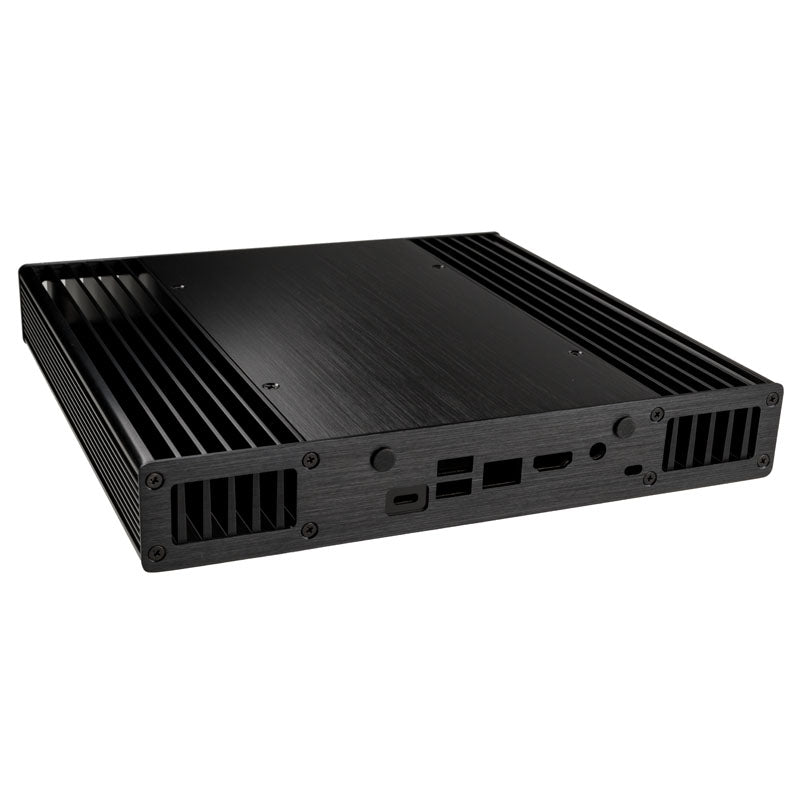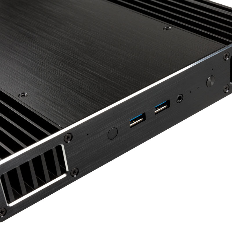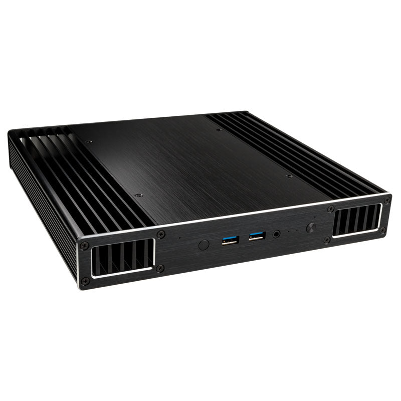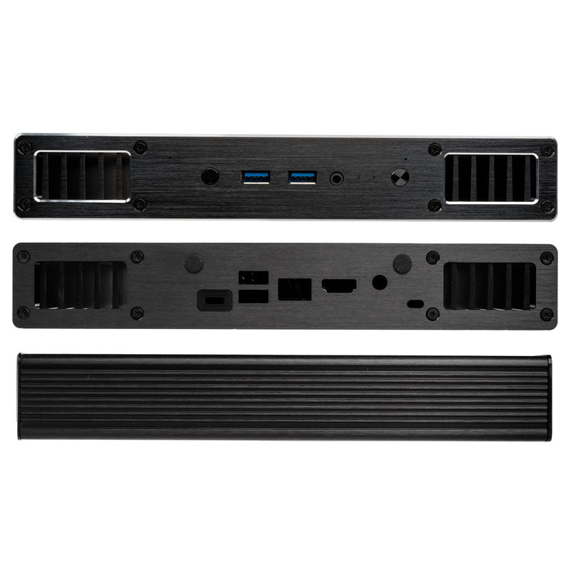 Kompaktes Gehäuse für UCFF-Boards (Intel NUC), Lüfterlose Kühlung durch passives Gehäusedesign mit großen Finnen, Edler Look durch gebürstetes Aluminium in schwarz, 2x USB 3.0-Ports und Audio in der Front, Platz für einen 2,5-Zoll-Datenträger, VESA-kompatibel