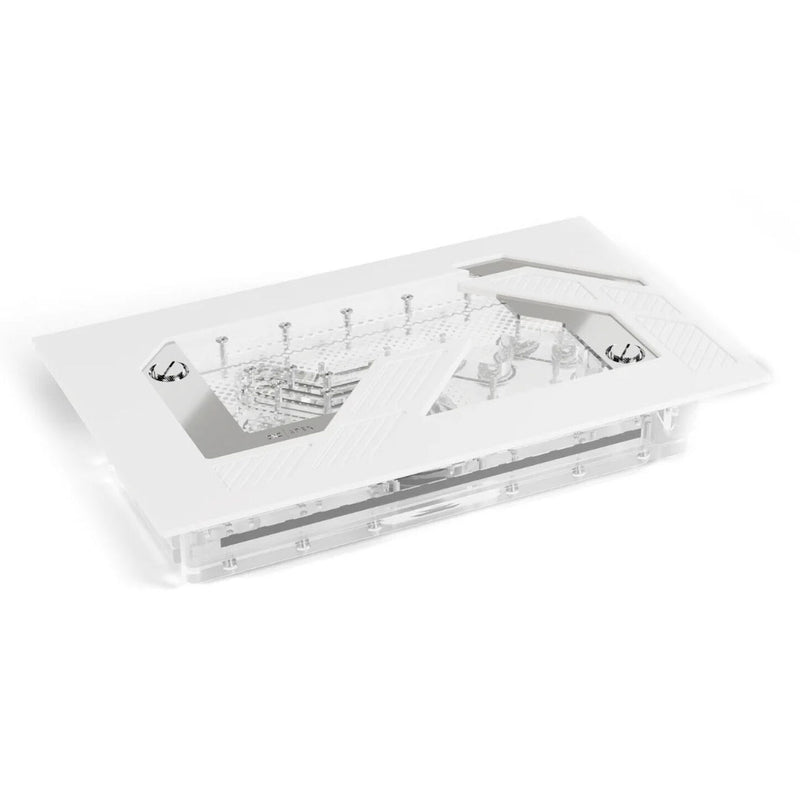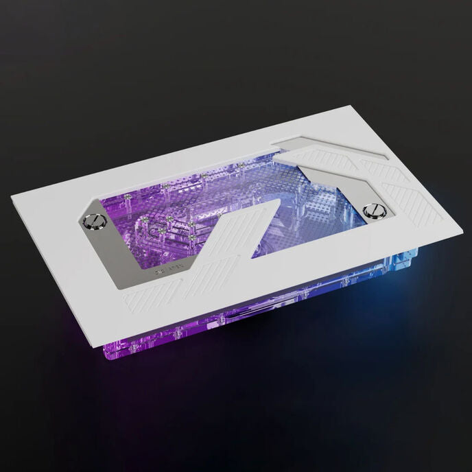 Entdecken Sie die Alphacool Apex Distroplate für das Dark Base Pro 901, ausgestattet mit der innovativen Apex Pumpe und einem ansprechenden RGB-Beleuchtungssystem in Weiß.