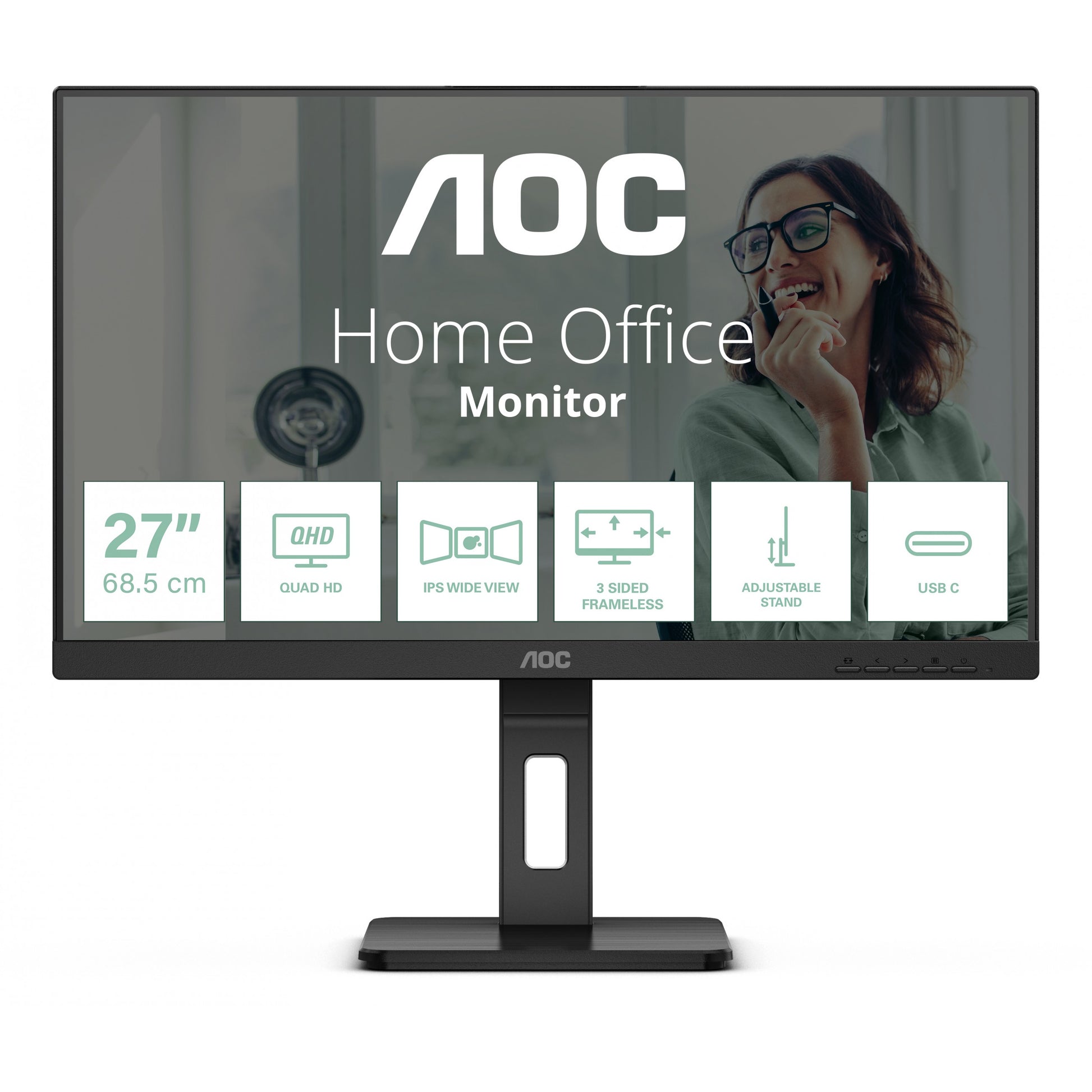 AOC Q27P3CV. Bildschirmdiagonale: 68.6 cm (27"). Display-Auflösung: 2560 x 1440 Pixel. HD-Typ: Quad HD. Bildschirmtechnologie: LED. Reaktionszeit: 4 ms. Natives Seitenverhältnis: 16:9. Bildwinkel. horizontal: 178°. Bildwinkel. vertikal: 178°. Eingebaute Lautsprecher. Integrierter USB-Hub. USB-Hub-Version: 3.2 Gen 1 (3.1 Gen 1). VESA-Halterung. Höhenverstellung. Produktfarbe: Schwarz