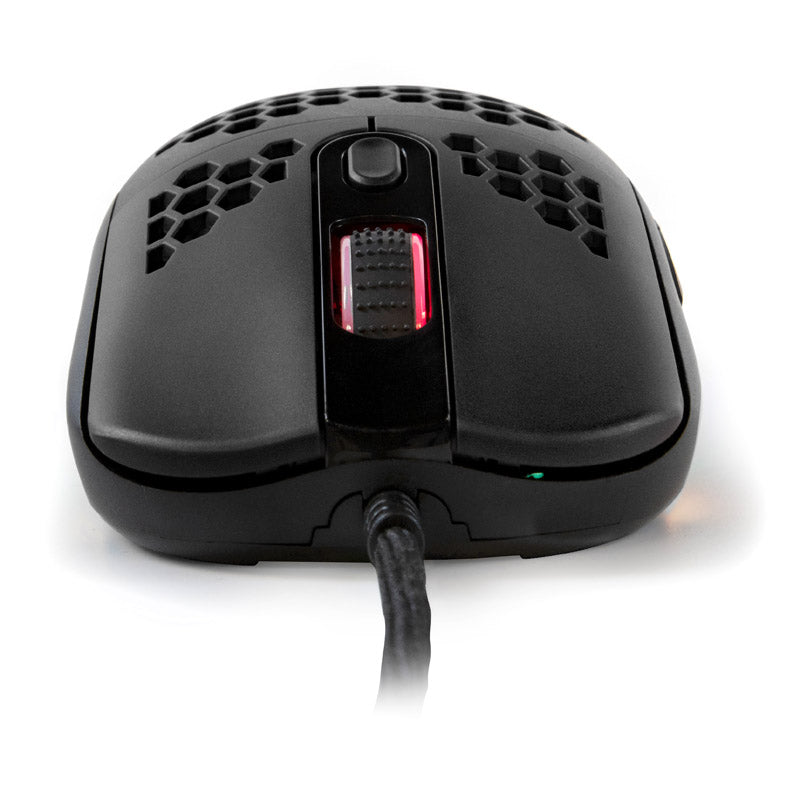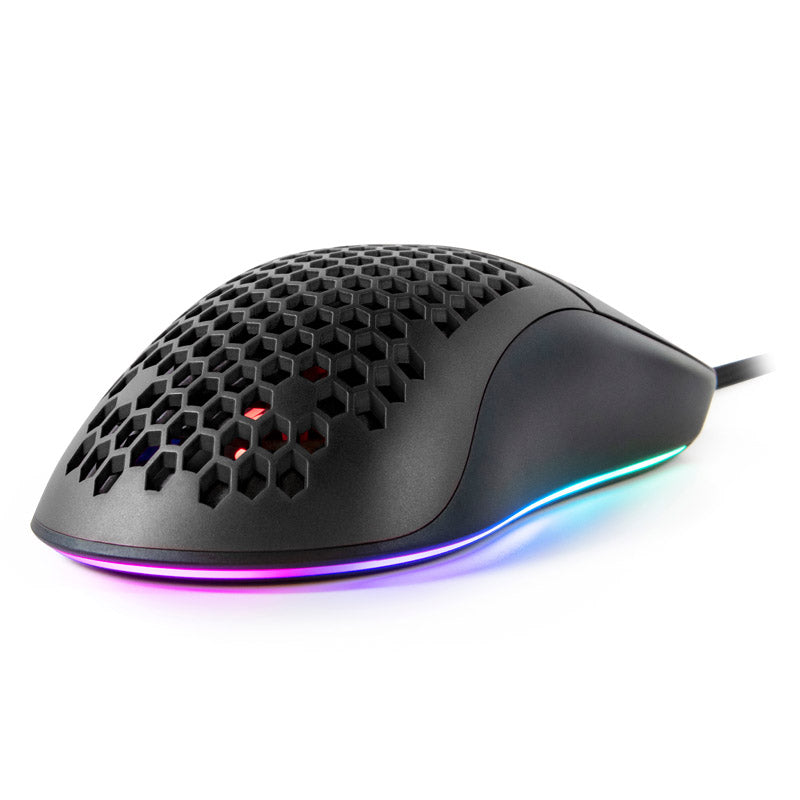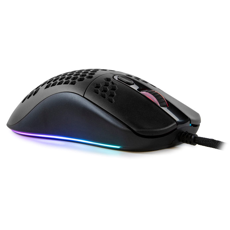 Extrem leichte Gaming-Maus in Schwarz, nur 74 Gramm Gewicht, mit PixArt-PMW-3389-Sensor, symmetrisches Design, max. 16.000 DPI, 7 Tasten inkl. Scrollrad, 1.000 Hz USB-Abfragerate, RGB-LED-Beleuchtung