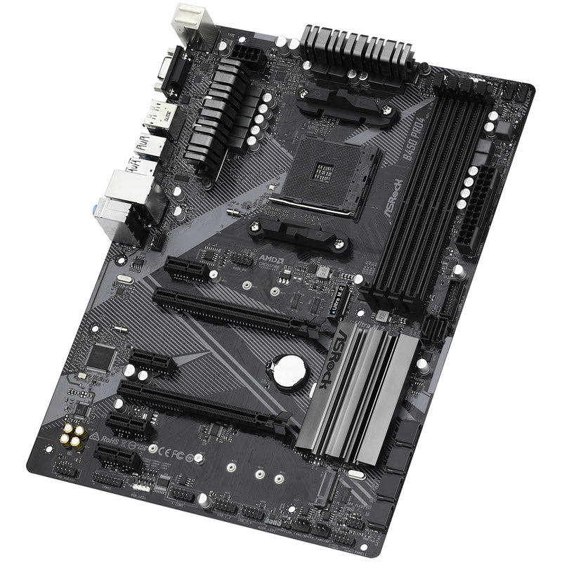 Micro-ATX-Mainboard mit AM4-Sockel, mit B450-Chipsatz, PCIe 3.0 für Grafikkarten, DDR4-Speicher bis 3.200 MHz, 2x M.2-Slots und 4x SATA, LAN