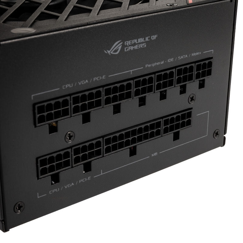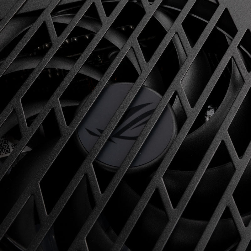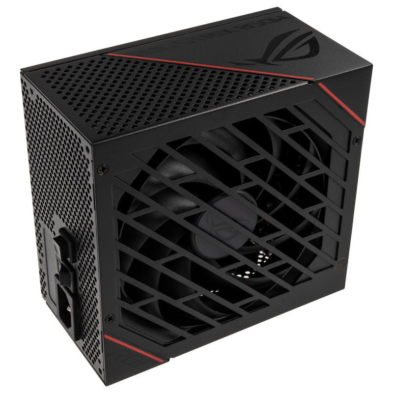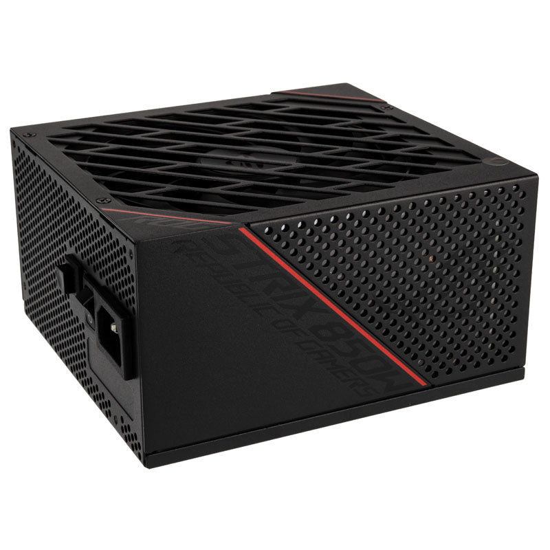 Schwarzes ATX-Netzteil von ASUS, 850 W Nennleistung, mit 80 PLUS Gold-Zertifizierung, ROG-Design, 2x 4+4-Pin / 6x 6+2-Pin / 8x SATA / 6x 4-Pol-Molex, modulares Kabelmanagement, 135-mm-Lüfter mit Semipassiv-Modus
