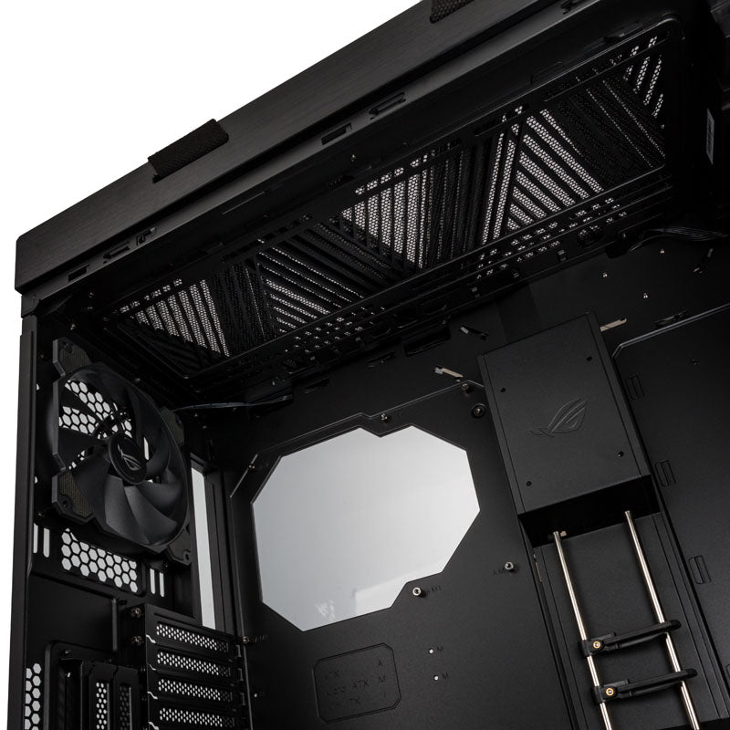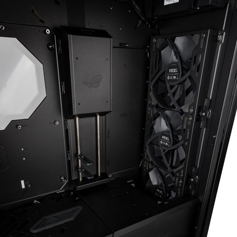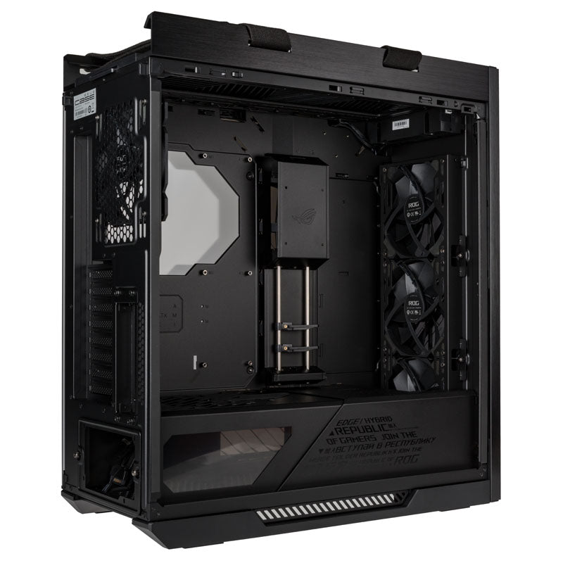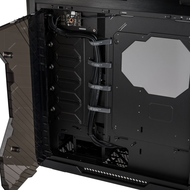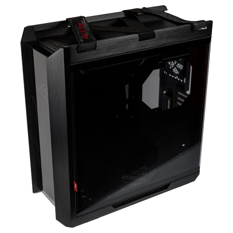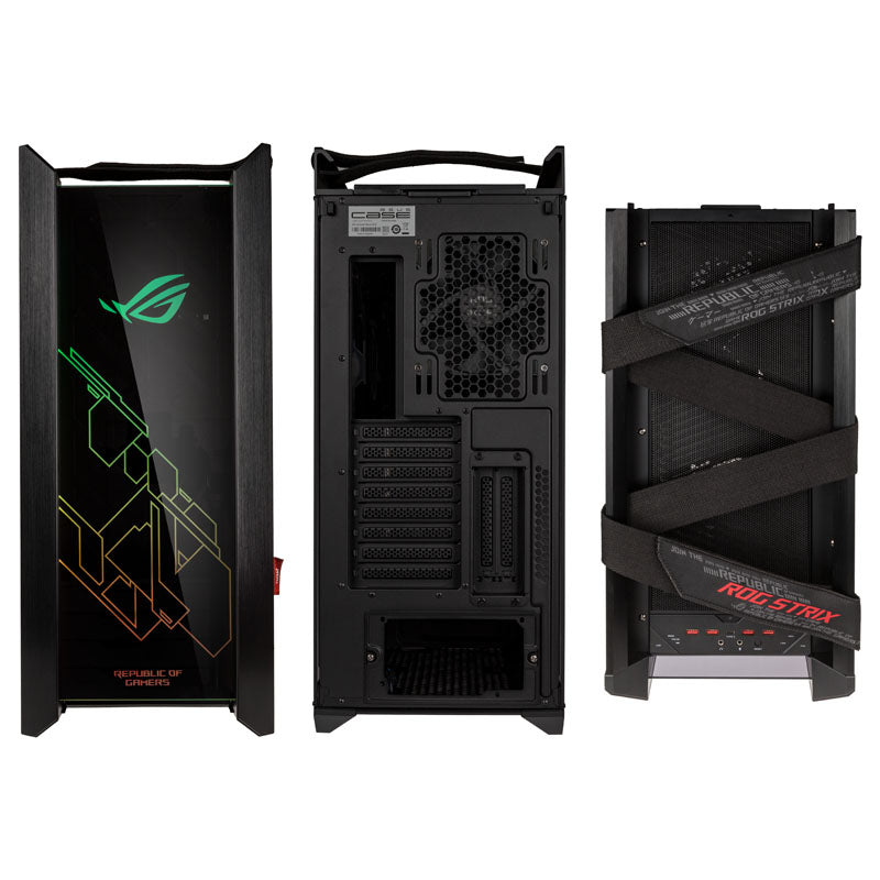 Edler Midi-Tower im ROG-Design, Seitentüren und Front aus Tempered Glass, adressierbare RGB-LED-Beleuchtung, Platz für 2x 360-mm-Radiator, max. 420-mm-Radiator, bis zu 450 mm lange Grafikkarten, ASUS Aura Sync & vier vorinstallierte Fans