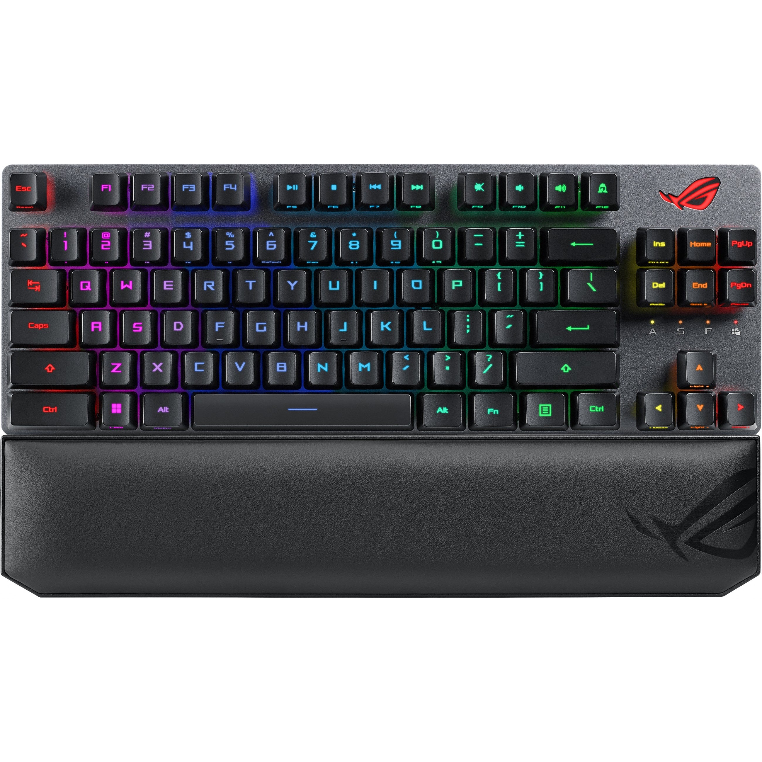 ASUS ROG Strix Scope RX TKL Wireless Deluxe. Tastatur Formfaktor: 80%. Tastatur-Stil: Gerade. Übertragungstechnik: Verkabelt & Kabellos. Geräteschnittstelle: USB + RF Wireless + Bluetooth. Tastatur-Switch: Mechanischer Switch. Tastaturaufbau: AZERTY. Typ der Hintergrundbeleuchtung: RGB-LED. Handgelenkauflage. Empfohlene Nutzung: Gaming. Produktfarbe: Schwarz