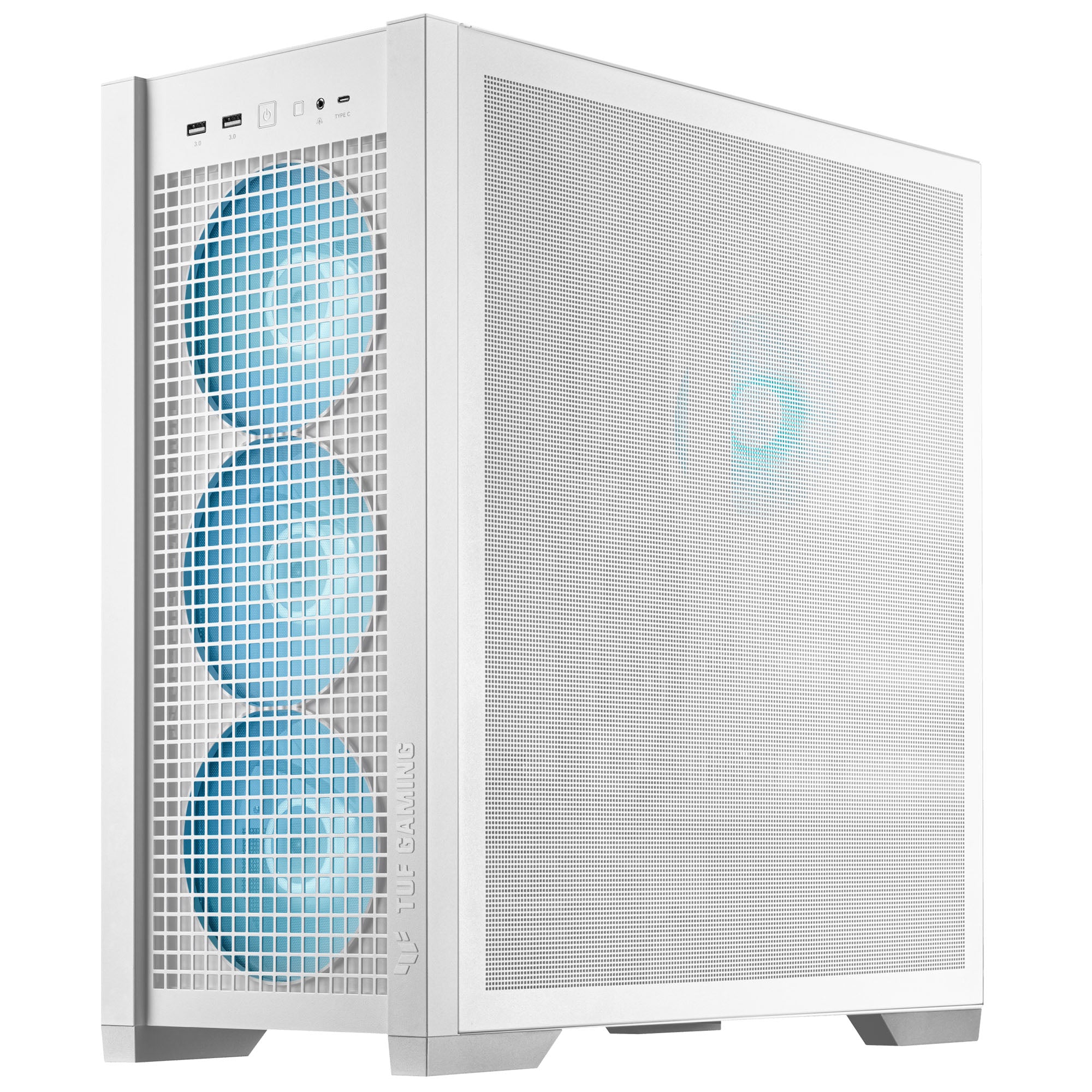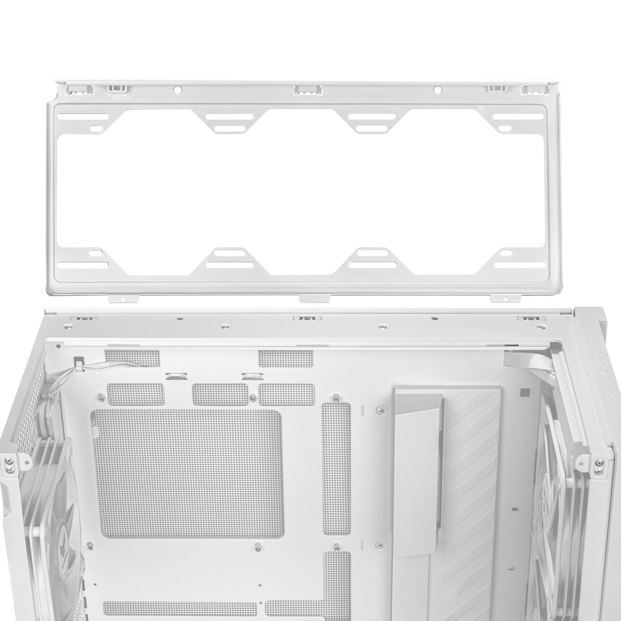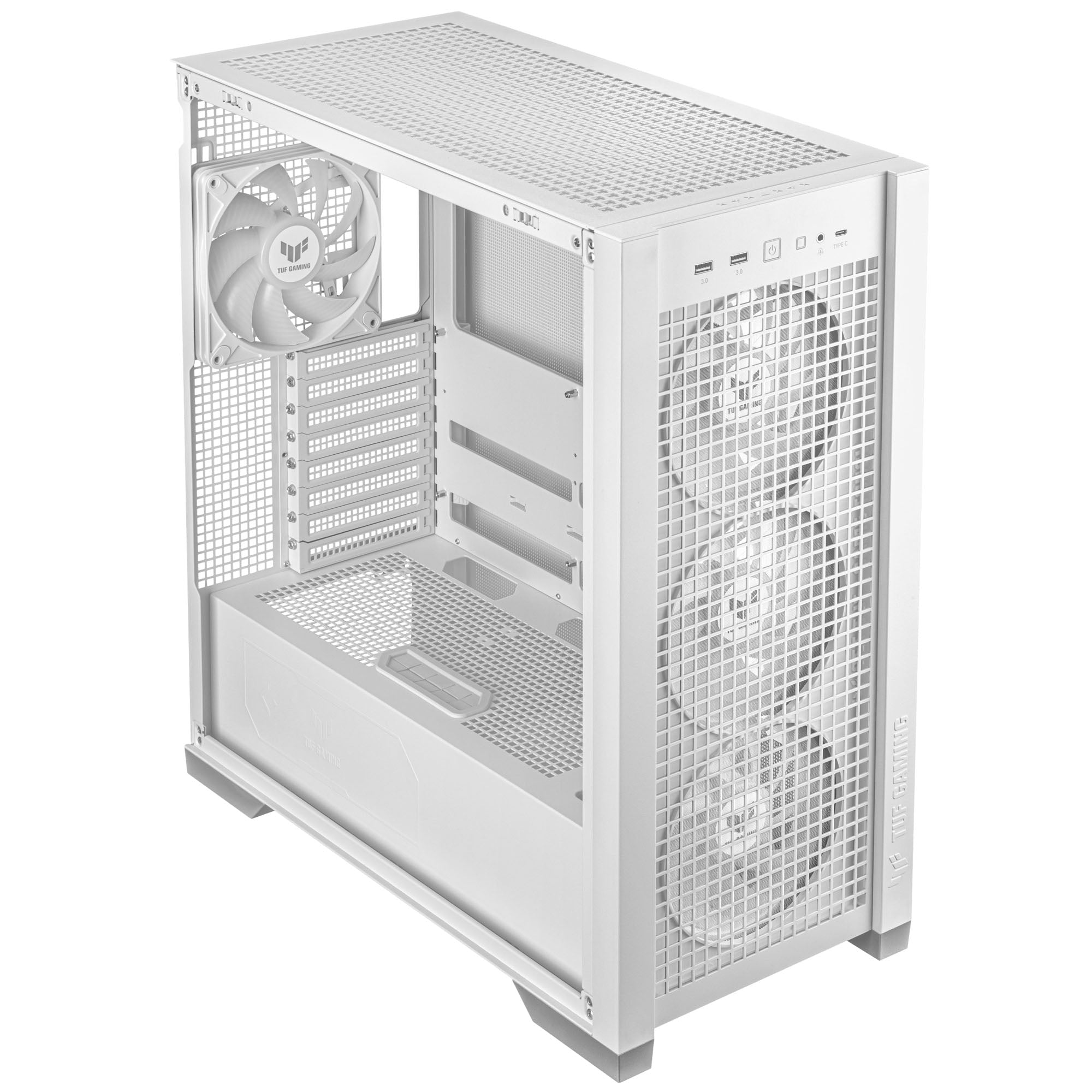 Edler Midi-Tower von ASUS in Weiß, Seitenteil aus Tempered Glass, Abnehmbares Oberteil, 4x 140-mm-Lüfter mit ARGB vorinstalliert, Platz für 1x 280/360-mm-Radiator, Grafikkarten bis 407 mm, 2x USB 3.2 Gen1 / 1x USB 3.2 Gen2x2 Typ-C