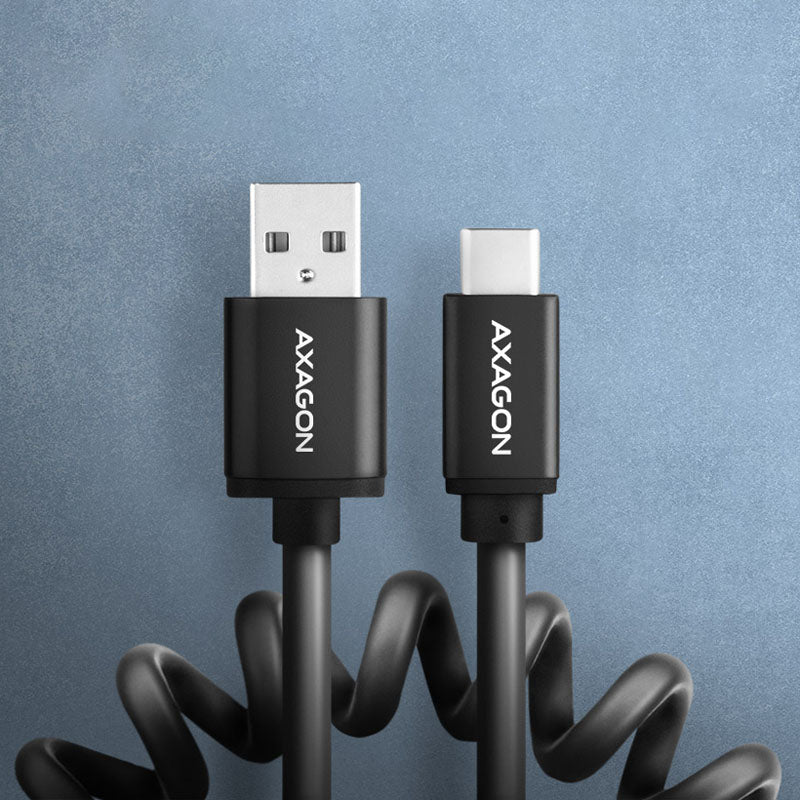 AXAGON BUCM-AM20TB Spiralkabel, USB-C zu USB-A, 1 m, USB 2.0, 2.4 A, ALU, PVC - Schwarz