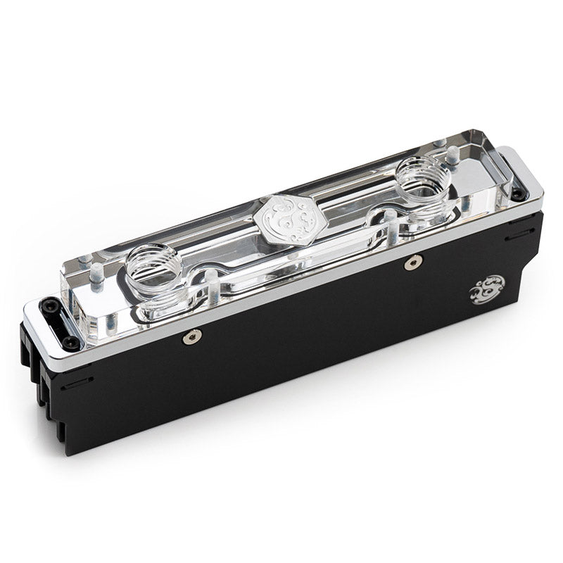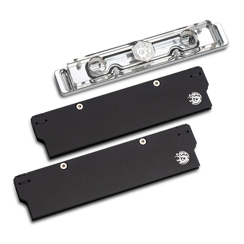 Die zwei schwarzen Kühlkörper aus anodisiertem Aluminium sorgen für eine effektive Wärmeableitung, während der DIMM-Block aus hochwertigem Acrylglas eine ansprechende Ästhetik bietet. Das transparente Design erlaubt es, das Innere Ihres Systems stilvoll zur Schau zu stellen und verleiht Ihrem Setup einen eleganten Touch.