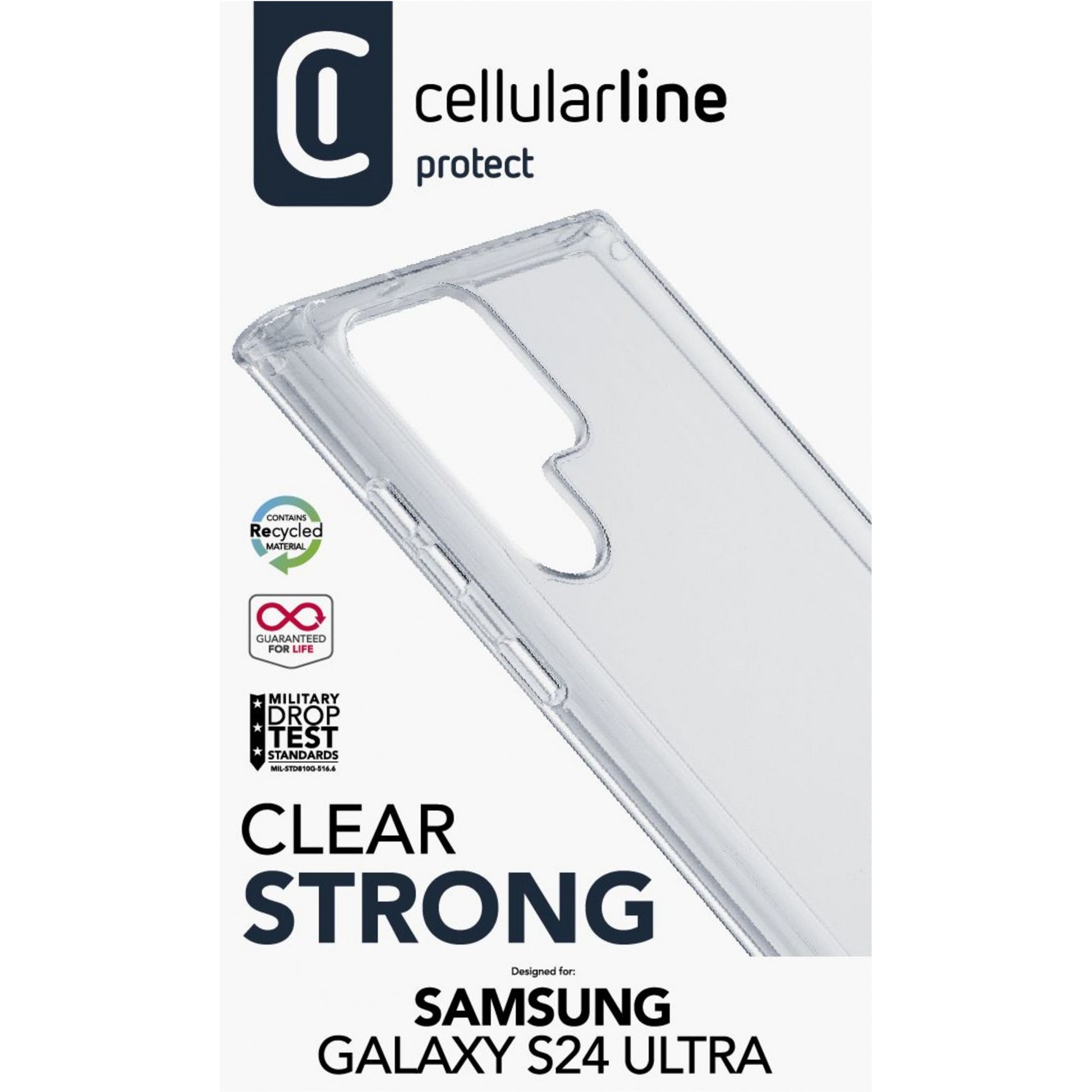 Cellularline Clear Strong - Galaxy S24 Ultra Starre Schutzhülle mit Gummirändern. Etui-Typ: Cover. Markenkompatibilität: Samsung. Kompatibilität: Galaxy S24 Ultra. Maximale Bildschirmgröße: 17.3 cm (6.8"). Oberflächenfärbung: Einfarbig. Produktfarbe: Transparent