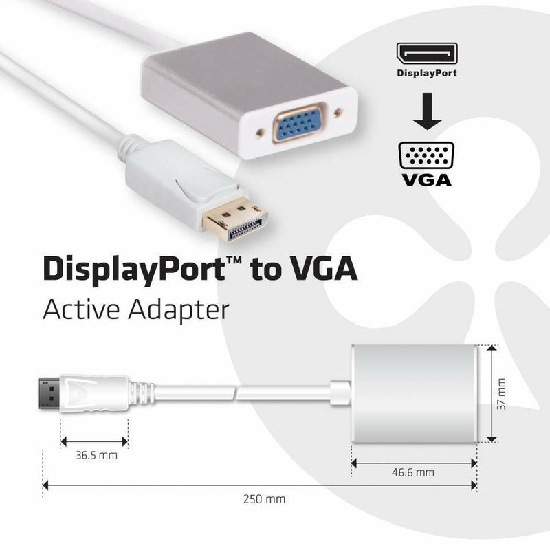 CLUB3D DisplayPort auf VGA Aktiver Adapter. Anschluss 1: DisplayPort. Anschluss 2: VGA. Produktfarbe: Schwarz