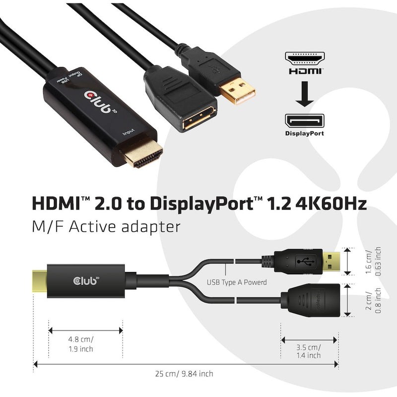 CLUB3D HDMI 2.0 TO DISPLAYPORT 1.2 4K60HZ HDR M/F ACTIVE ADAPTER. Anschluss 1: HDMI. Anschluss 2: DisplayPort. Kabellänge: 0.25 m. Produktfarbe: Schwarz