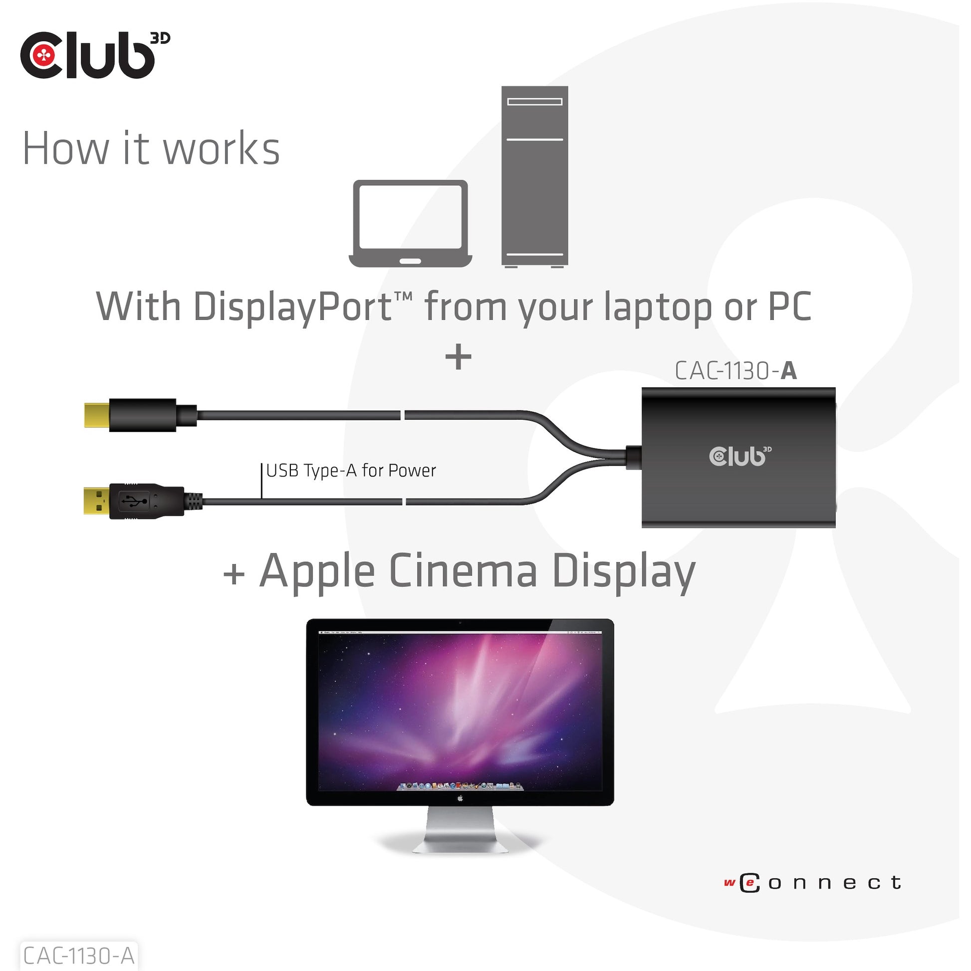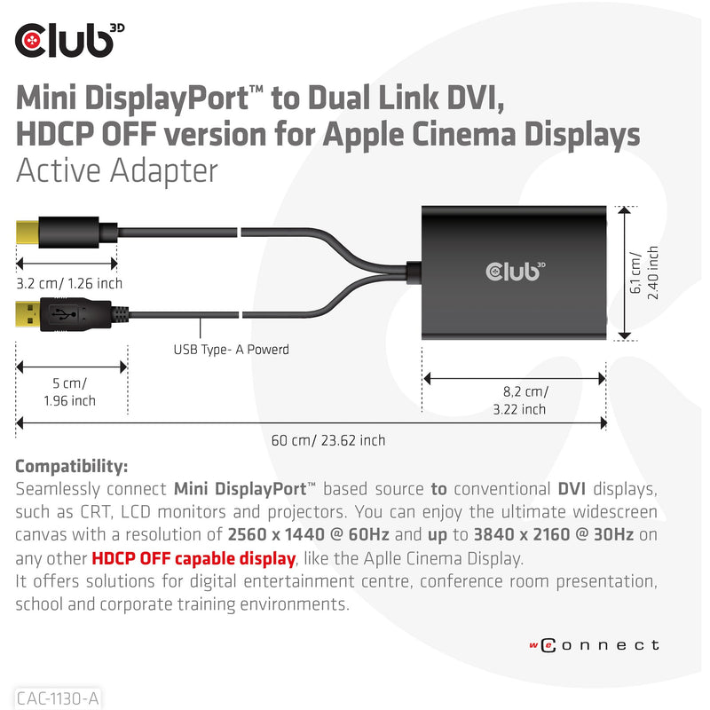 CLUB3D Mini DisplayPort to Dual Link DVI. HDCP OFF version for Apple Cinema Displays Active Adapter. Kabellänge: 0.6 m. Anschluss 1: DVI-D. Anschluss 2: Mini DisplayPort + USB Type-A. Zertifizierung: ROHS. FCC. CE EMI. Stecker 1 Abmessungen (BxTxH): 61 x 83 x 14 mm. Gewicht: 109 g. Verpackungsbreite: 145 mm. Verpackungstiefe: 45 mm. Verpackungshöhe: 145 mm. Menge pro Packung: 1 Stück(e)