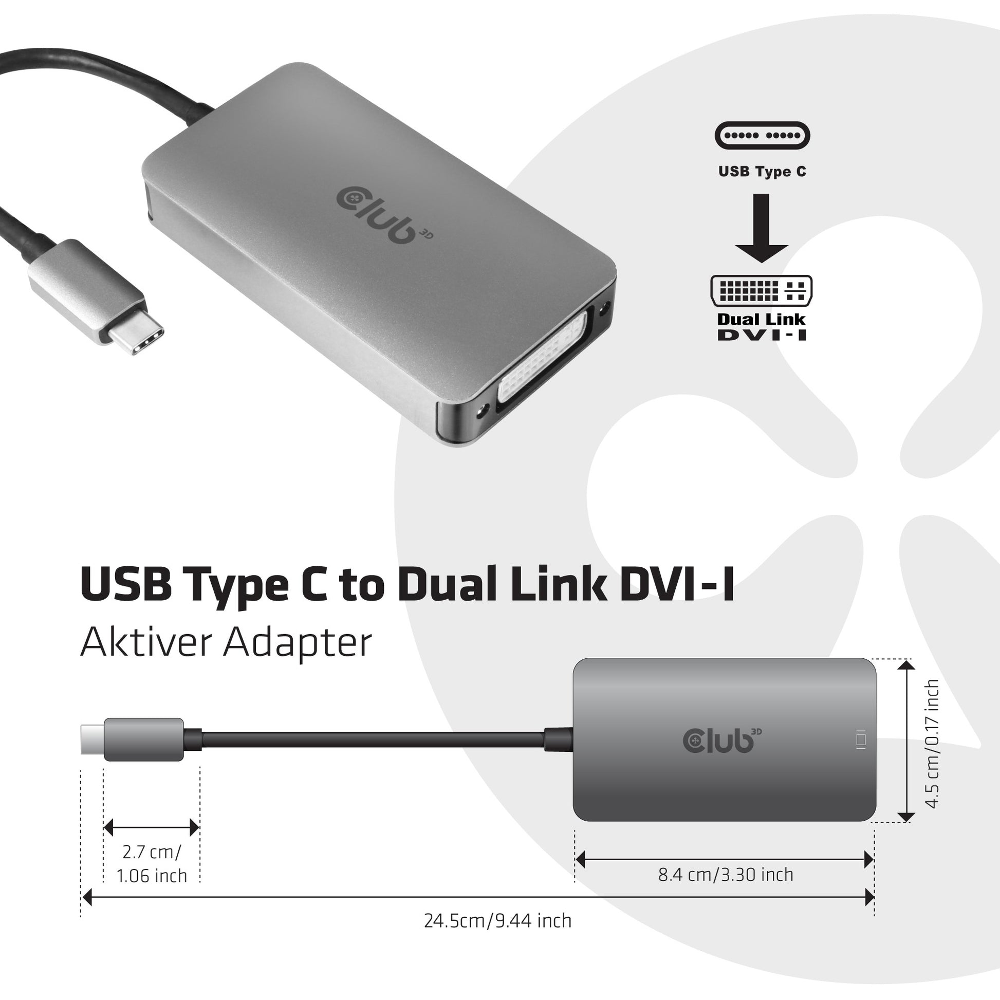 CLUB3D USB3.2 Gen1 Type-C to Dual Link DVI-D HDCP ON version Active Adapter M/F. Anschluss 1: USB C. Anschluss 2: DVI-D Dual link. Produktfarbe: Grau