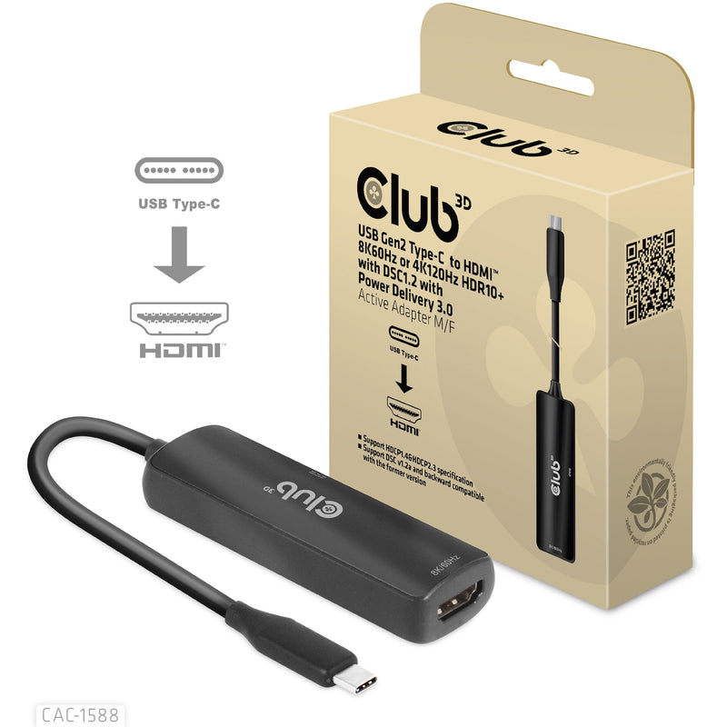 CLUB3D USB Gen2 Typ-C zu HDMI™ 8K60Hz oder 4K120Hz HDR10. DSC1.2. Power Delivery 3.0 Activ Adapter St./B.. Kabellänge: 0.17 m. Anschluss 1: USB Typ-C. Anschluss 2: HDMI. Zertifizierung: Meets ROHS. FCC. and CE EMI requirements. Stecker 1 Abmessungen (BxTxH): 29 x 12 x 7 mm. Gewicht: 40 g. Verpackungsbreite: 100 mm. Verpackungstiefe: 100 mm. Verpackungshöhe: 35 mm. Menge pro Packung: 1 Stück(e). Verpackungsinhalt: CAC- 1588 USB Gen2 Type-C to HDMI™ 8K60Hz or 4K120Hz HDR10+ with DSC1.2 with Power Delivery 3.0...