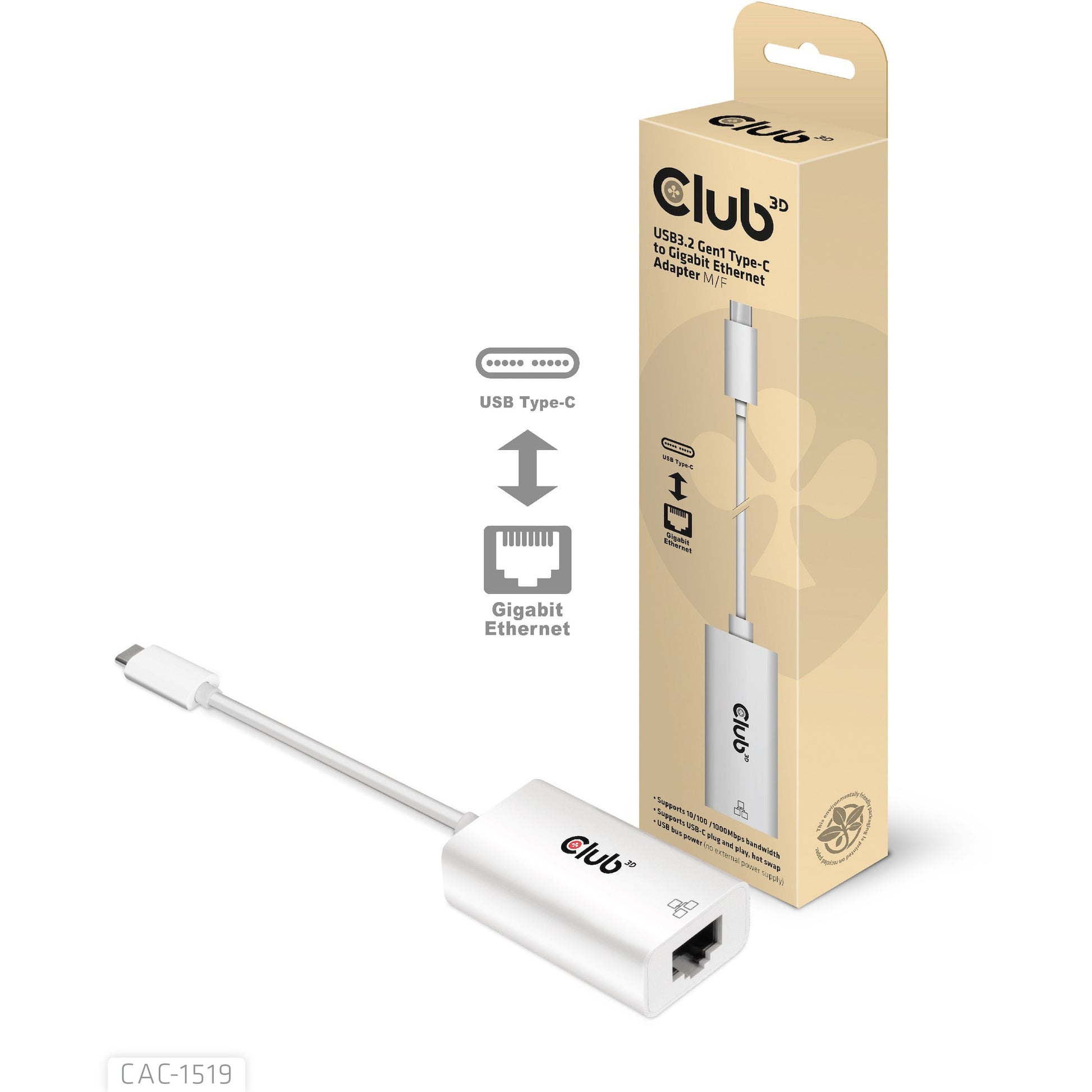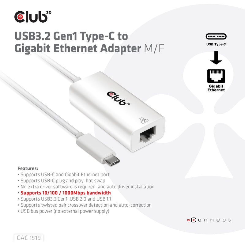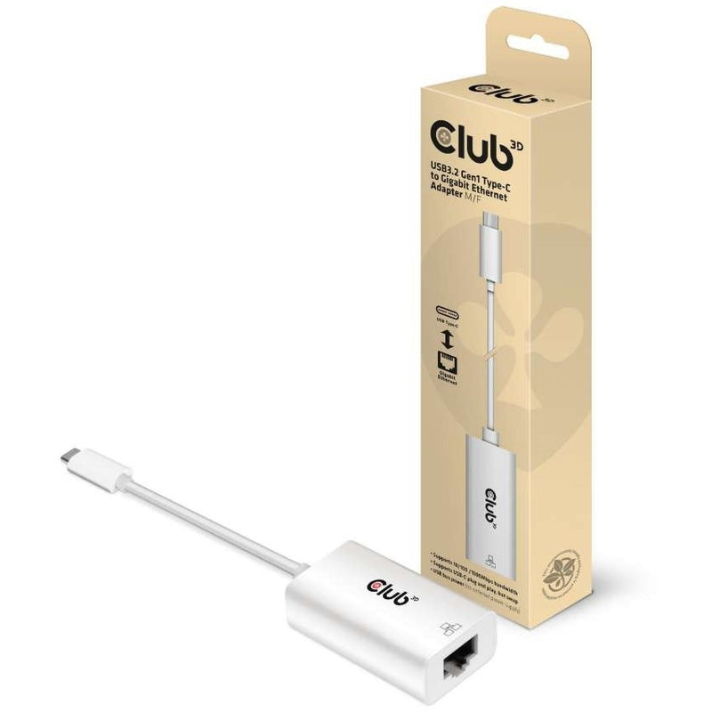 CLUB3D USB3.2 Gen1 Type-C to Gigabit Ethernet Adapter M/F. Anschluss 1: USB-C. Anschluss 2: RJ-45. Kabellänge: 0.19 m. Produktfarbe: Weiß