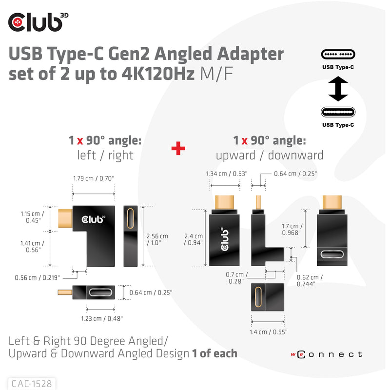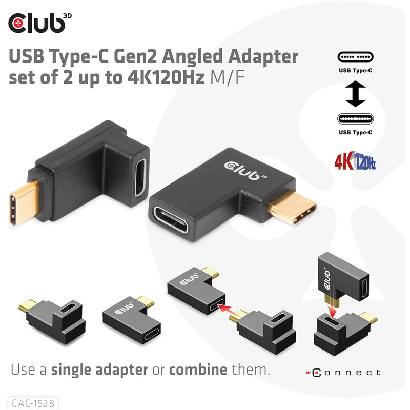 CLUB3D USB Type-C Gen2 Angled Adapter set of 2 up to 4K120Hz M/F. Anschluss 1: USB C. Anschluss 2: USB C