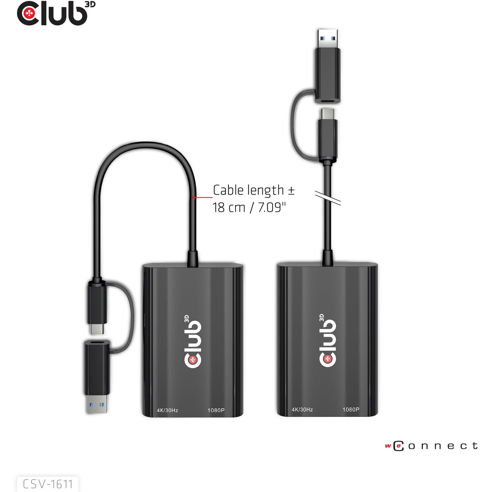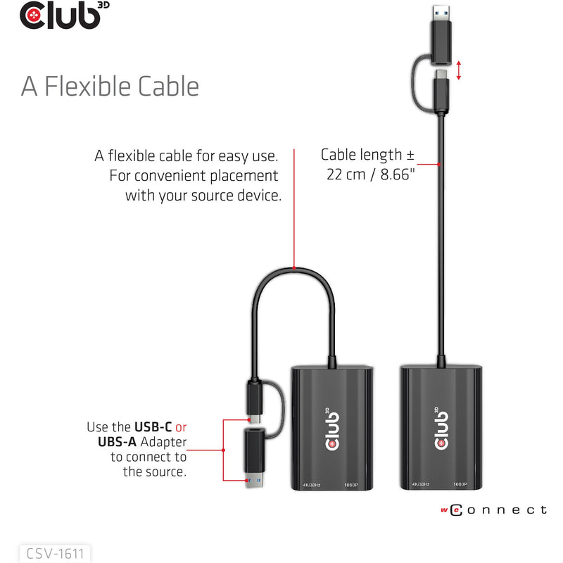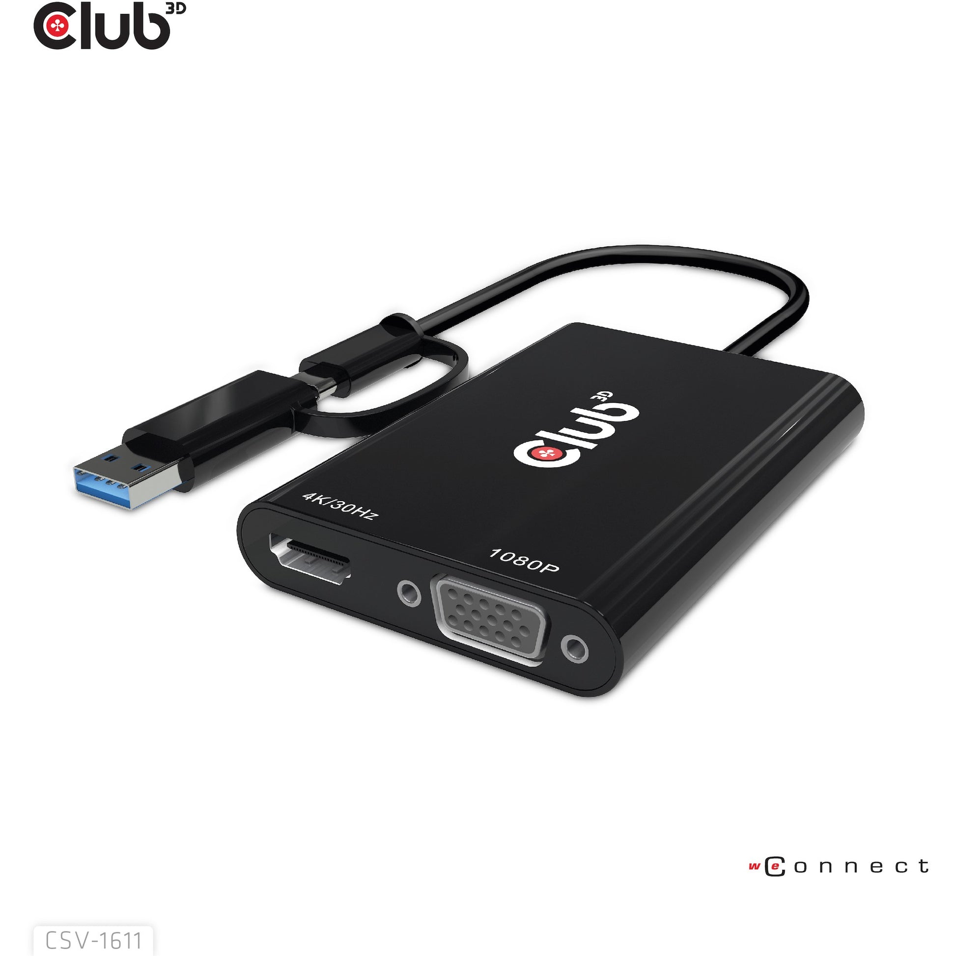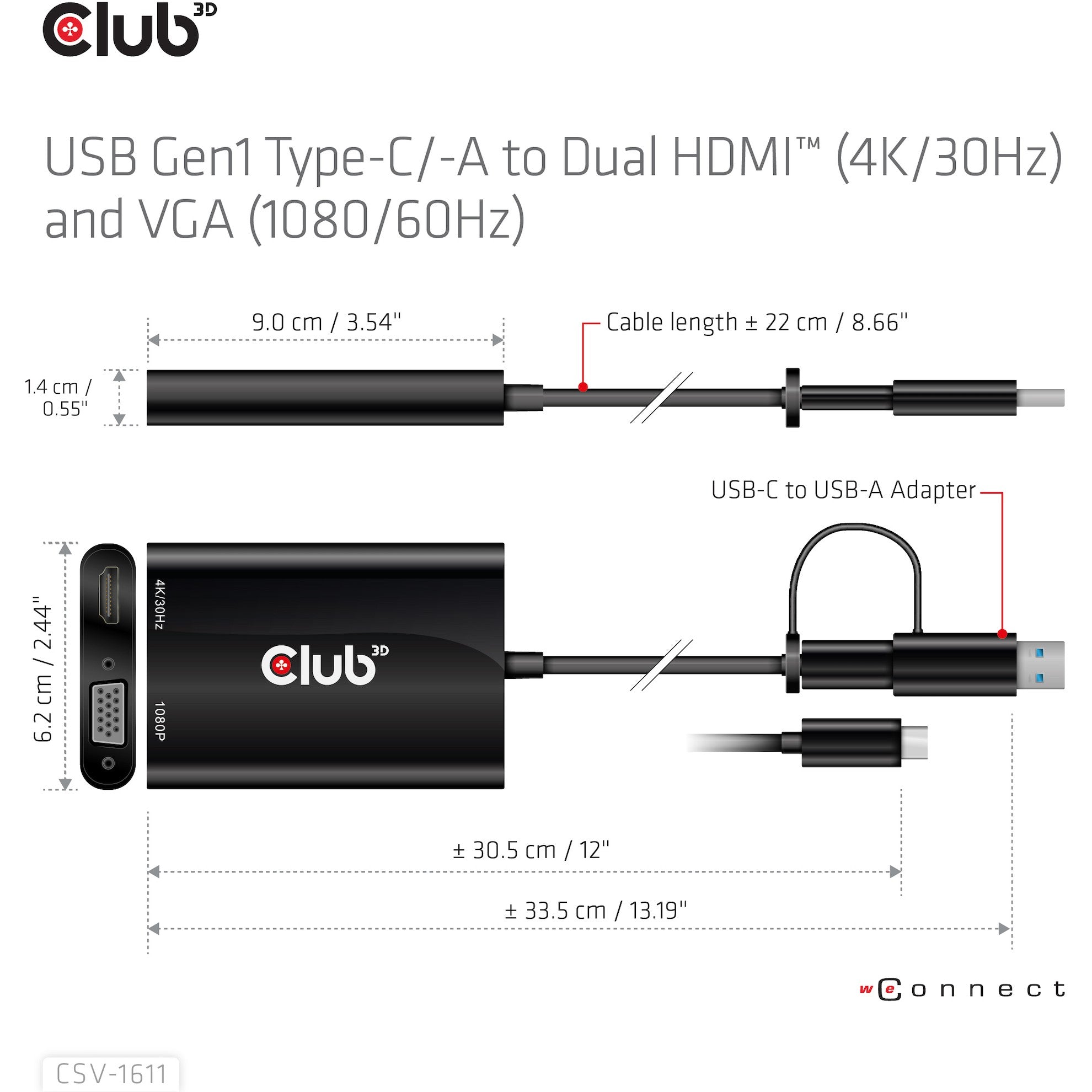CLUB3D USB Gen1 Type-C/-A to Dual HDMI (4K/30Hz) / VGA (1080/60Hz). Maximale Auflösung: 3840 x 2160 Pixel. Bildwiederholfrequenz bei maximaler Auflösung: 30 Hz. Unterstützte Grafik-Auflösungen: 1920 x 1080 (HD 1080). Produktfarbe: Schwarz. Breite: 62.2 mm. Tiefe: 91 mm. Höhe: 14.1 mm. Verpackungsart: Box. Verpackungsbreite: 80 mm. Verpackungstiefe: 35 mm. Menge pro Packung: 1 Stück(e)