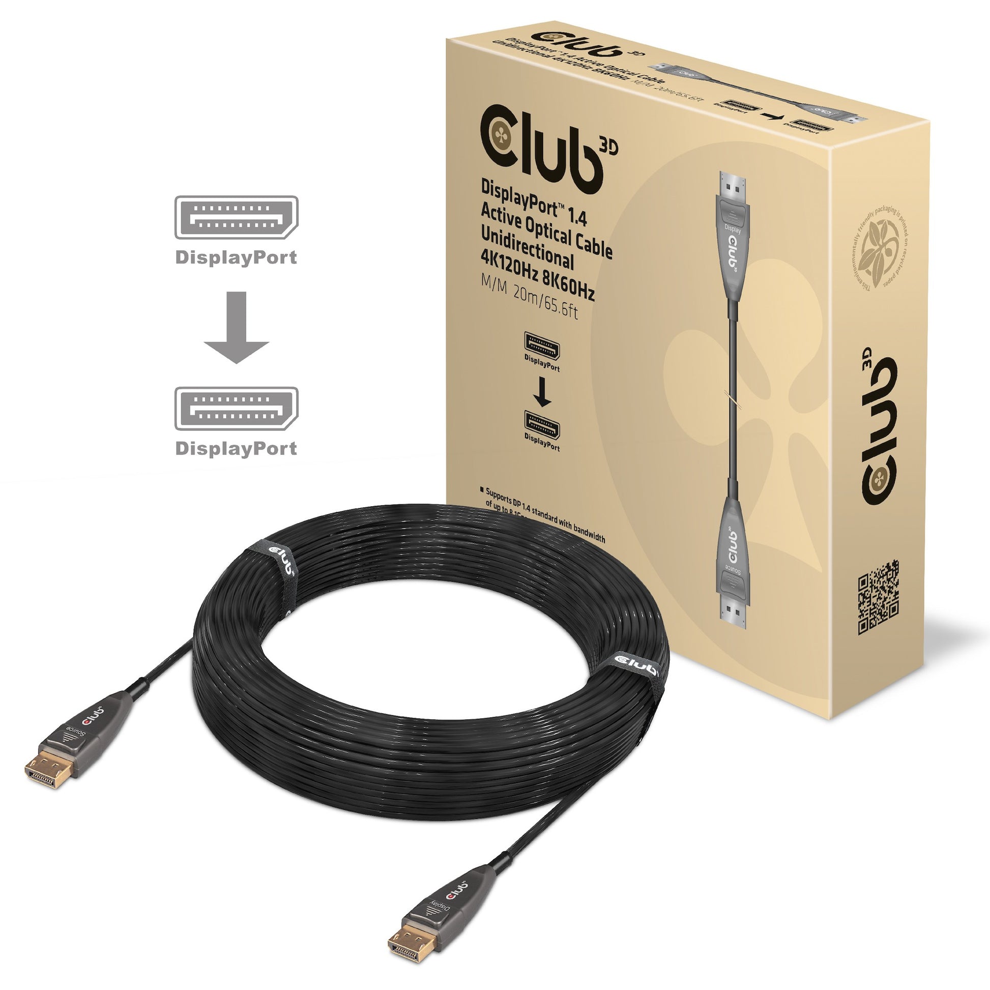 CLUB3D DisplayPort 1.4 Active Optical Cable Unidirectional 4K120Hz 8K60Hz M/M 20m/65.62ft. Kabellänge: 20 m. Anschluss 1: DisplayPort. Anschluss 2: DisplayPort. Zertifizierung: ROHS. FCC. CE EMI. Gewicht: 665 g. Verpackungsbreite: 230 mm. Verpackungstiefe: 50 mm. Verpackungshöhe: 230 mm