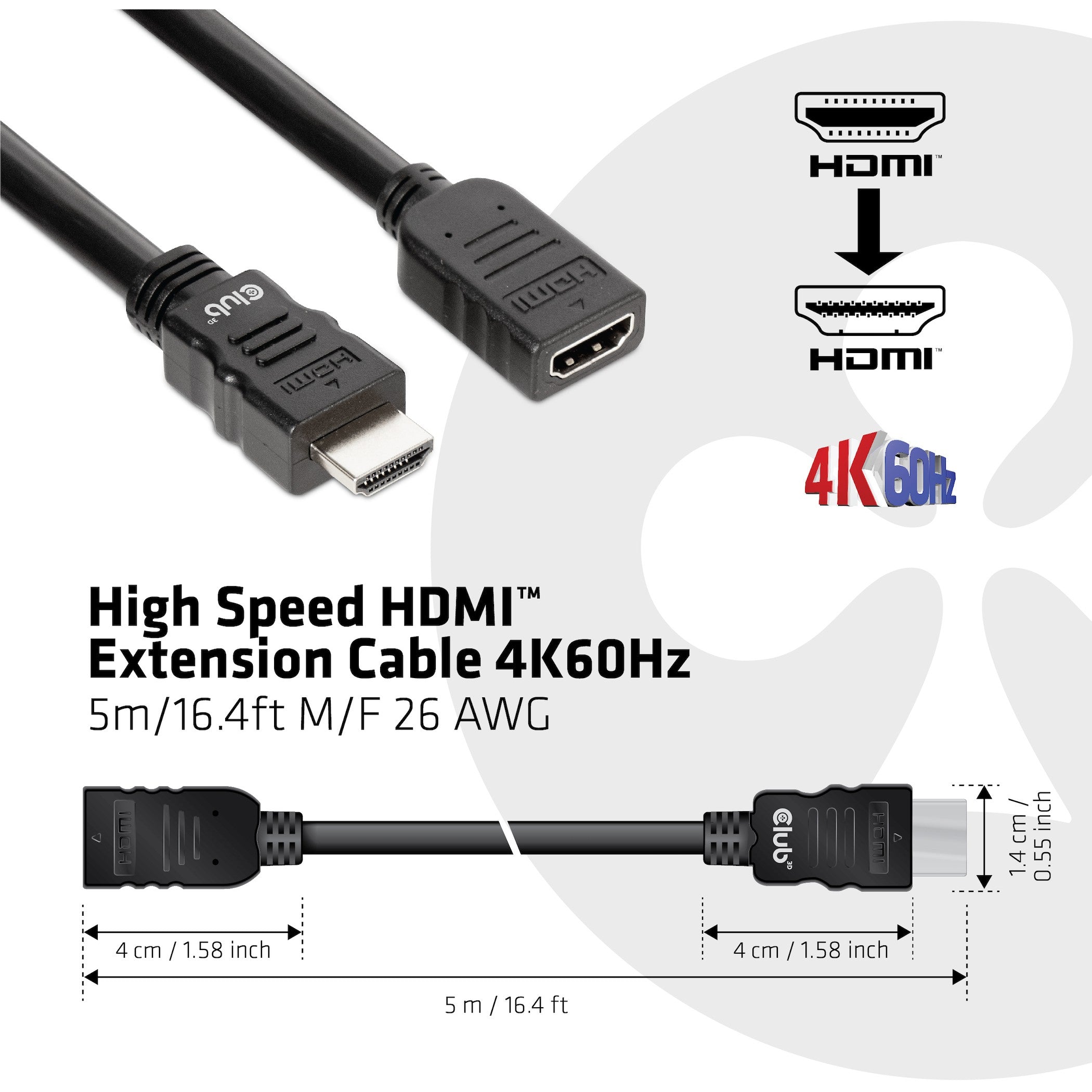 CLUB3D High Speed HDMI™ Extension Cable 4K60Hz M/F 5m/16.4ft 26 AWG. Kabellänge: 5 m. Anschluss 1: HDMI Typ A (Standard). Steckverbinder 1 Geschlecht: Männlich. Anschluss 2: HDMI Typ A (Standard). Steckverbinder 2 Geschlecht: Weiblich. Beschichtung Steckerkontakte: Gold. HDMI-Version: 2.0. 3D. Datenübertragungsrate: 18 Gbit/s. Produktfarbe: Schwarz