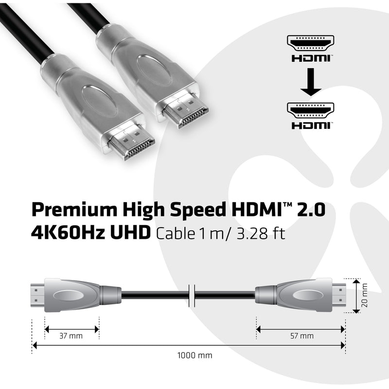 CLUB3D Premium High Speed HDMI™ 2.0 4K60Hz UHD Kabel 1 meter. Kabellänge: 1 m. Anschluss 1: HDMI Typ A (Standard). Anschluss 2: HDMI Typ A (Standard). Maximale Auflösung: 3840 x 2160 Pixel. Produktfarbe: Schwarz. Silber