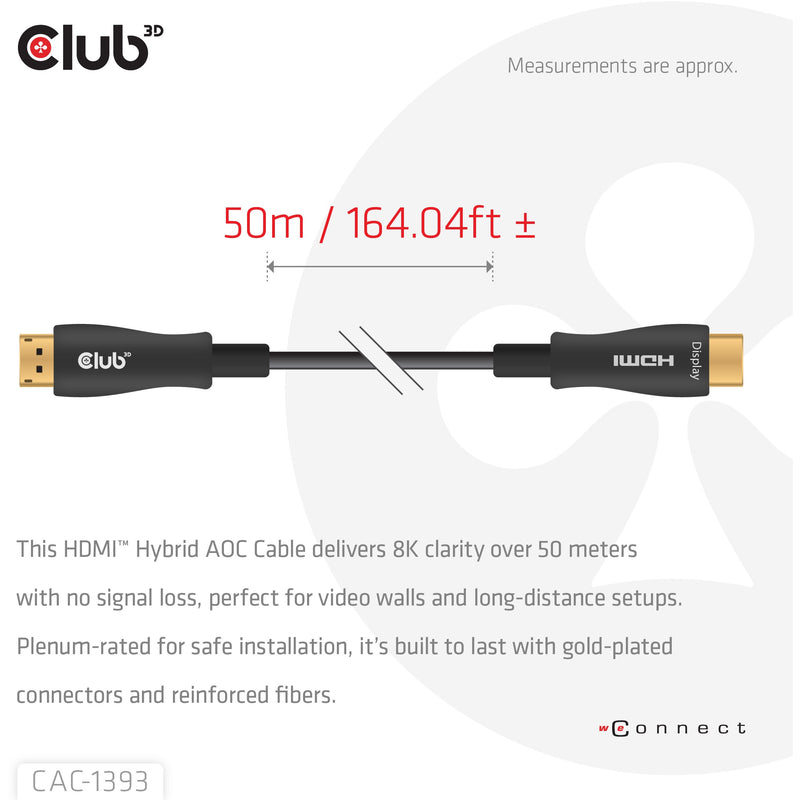 CLUB3D HDMI™ Hybrid AOC Cable 8K60Hz/4K120Hz 50m / 164.04ft. Kabellänge: 50 m. Anschluss 1: HDMI Typ A (Standard). Steckverbinder 1 Geschlecht: Männlich. Anschluss 2: HDMI Typ A (Standard). Steckverbinder 2 Geschlecht: Männlich. HDMI-Version: 2.1