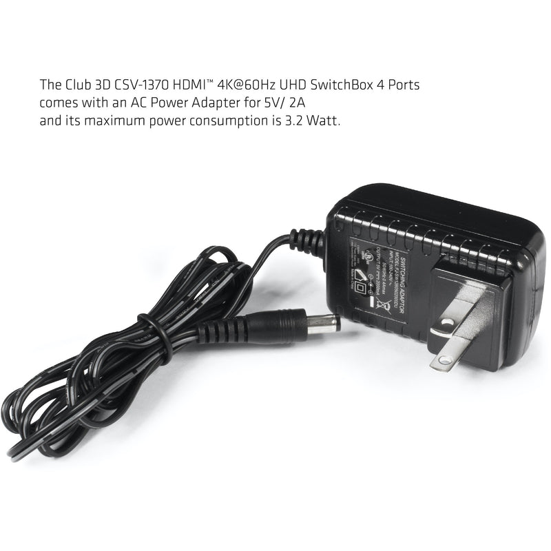 CLUB3D HDMI 2.0 UHD SwitchBox 4 Ports. Video Porttyp: HDMI. HDMI-Version: 2.0a. Maximale Auflösung: 4096 x 2160 Pixel. Produktfarbe: Schwarz. Gehäusematerial: Metall. AC Eingangsspannung: 5 V. Ausgangsstrom: 1 A. Stromverbrauch (Standardbetrieb): 5 W. Breite: 122 mm. Tiefe: 20 mm. Höhe: 50 mm. Verpackungsbreite: 180 mm. Verpackungstiefe: 80 mm. Verpackungshöhe: 137 mm