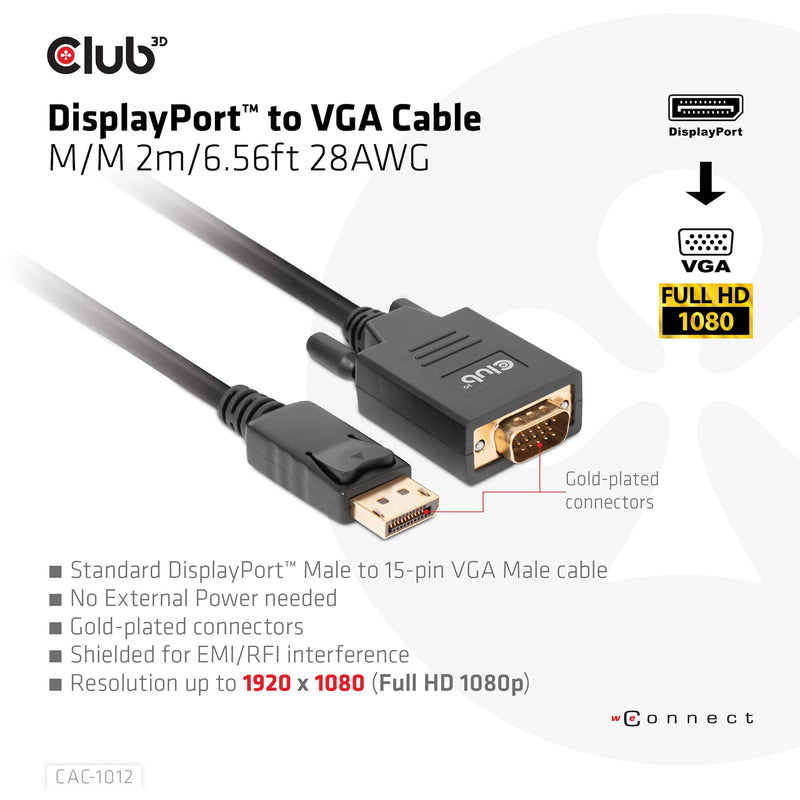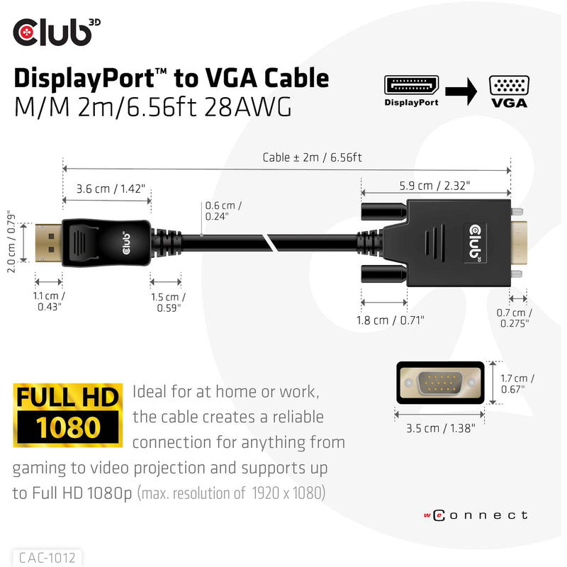 CLUB3D DisplayPort to VGA Cable M/M. Kabellänge: 2 m. Anschluss 1: DisplayPort. Anschluss 2: VGA (D-Sub). Zertifizierung: ROHS. FCC. CE EMI. Stecker 1 Abmessungen (BxTxH): 20 x 47 x 13 mm. Stecker 2 Abmessungen (BxTxH): 33 x 44 x 16 mm. Gewicht: 98 g. Verpackungsbreite: 145 mm. Verpackungstiefe: 45 mm. Verpackungshöhe: 145 mm. Menge pro Packung: 1 Stück(e)