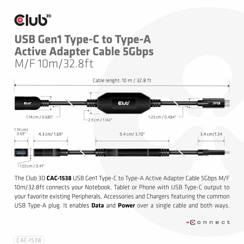 CLUB3D USB Gen1 Type-C to Type-A Active Adapter Cable 5Gbps M/F 10m/32.8ft. Kabellänge: 10 m. Anschluss 1: USB C. Anschluss 2: USB A. USB-Version: USB 3.2 Gen 1 (3.1 Gen 1). Max. Datenübertragungsrate: 5 Gbit/s. Produktfarbe: Schwarz