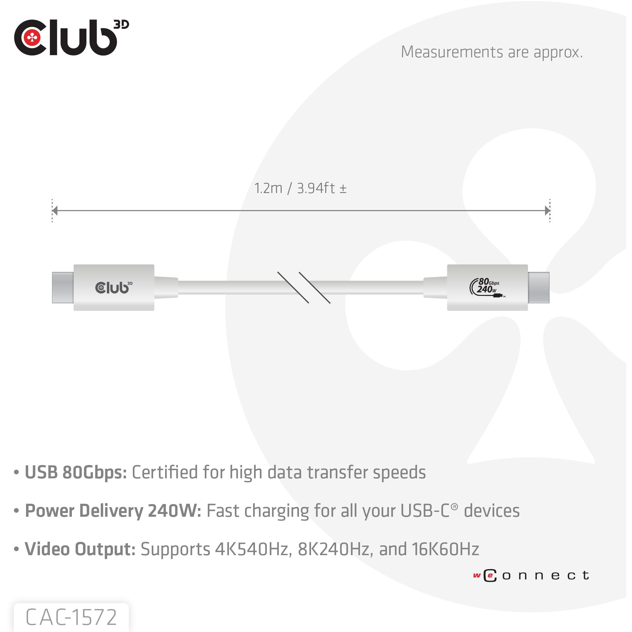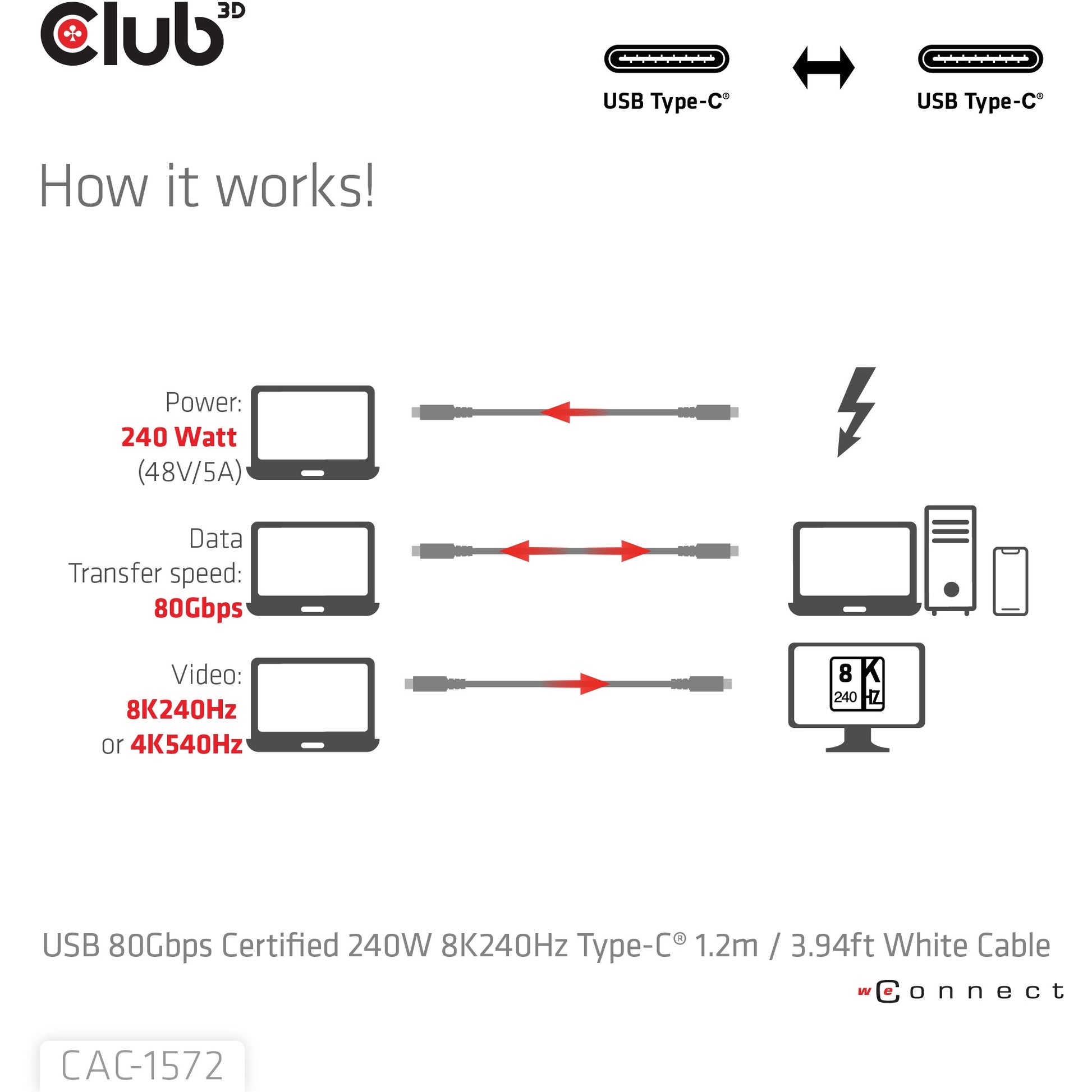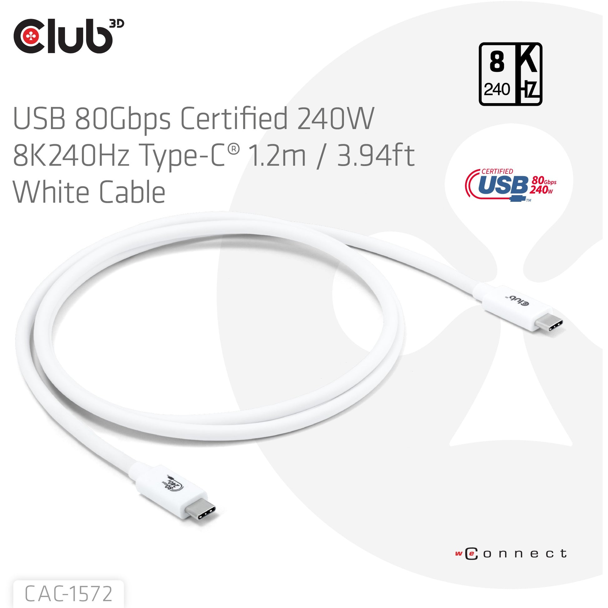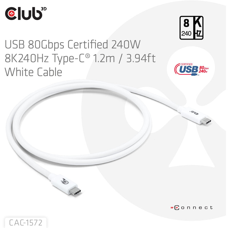 CLUB3D USB 80Gbps Certified 240W 8K240Hz Type-C® 1.2m / 3.94ft White Cable