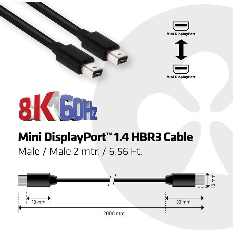 CLUB3D Mini DisplayPort 1.4 Kabel HBR3 8K60Hz Stecker / Stecker 2 meter. Kabellänge: 2 m. Anschluss 1: Mini Displayport. Anschluss 2: Mini Displayport. Konformitätsbescheinigungen: RoHS. Zertifizierung: RHOS. CE. FCC. Verpackungsbreite: 175 mm. Verpackungstiefe: 45 mm. Verpackungshöhe: 175 mm. Länge (mm): 4000 mm
