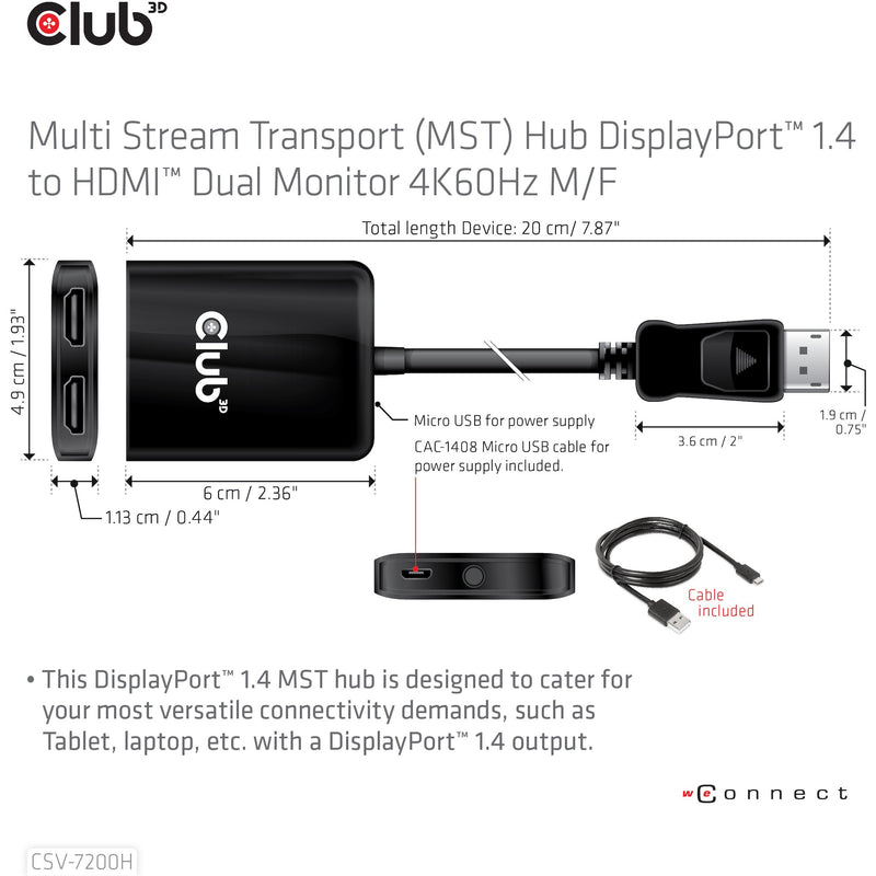 CLUB3D CSV-7200H. Video Porttyp: DisplayPort. Teilnehmerausgang: 2x HDMI. Zertifizierung: Meets ROHS. FCC. and CE EMI requirements. Ursprungsland: China
