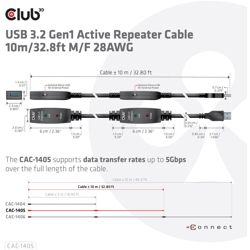 CLUB3D CAC-1405. Kabellänge: 10 m. Anschluss 1: USB A. Anschluss 2: USB A. USB-Version: USB 3.2 Gen 2 (3.1 Gen 2). Produktfarbe: Schwarz