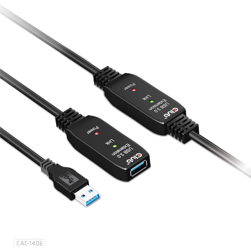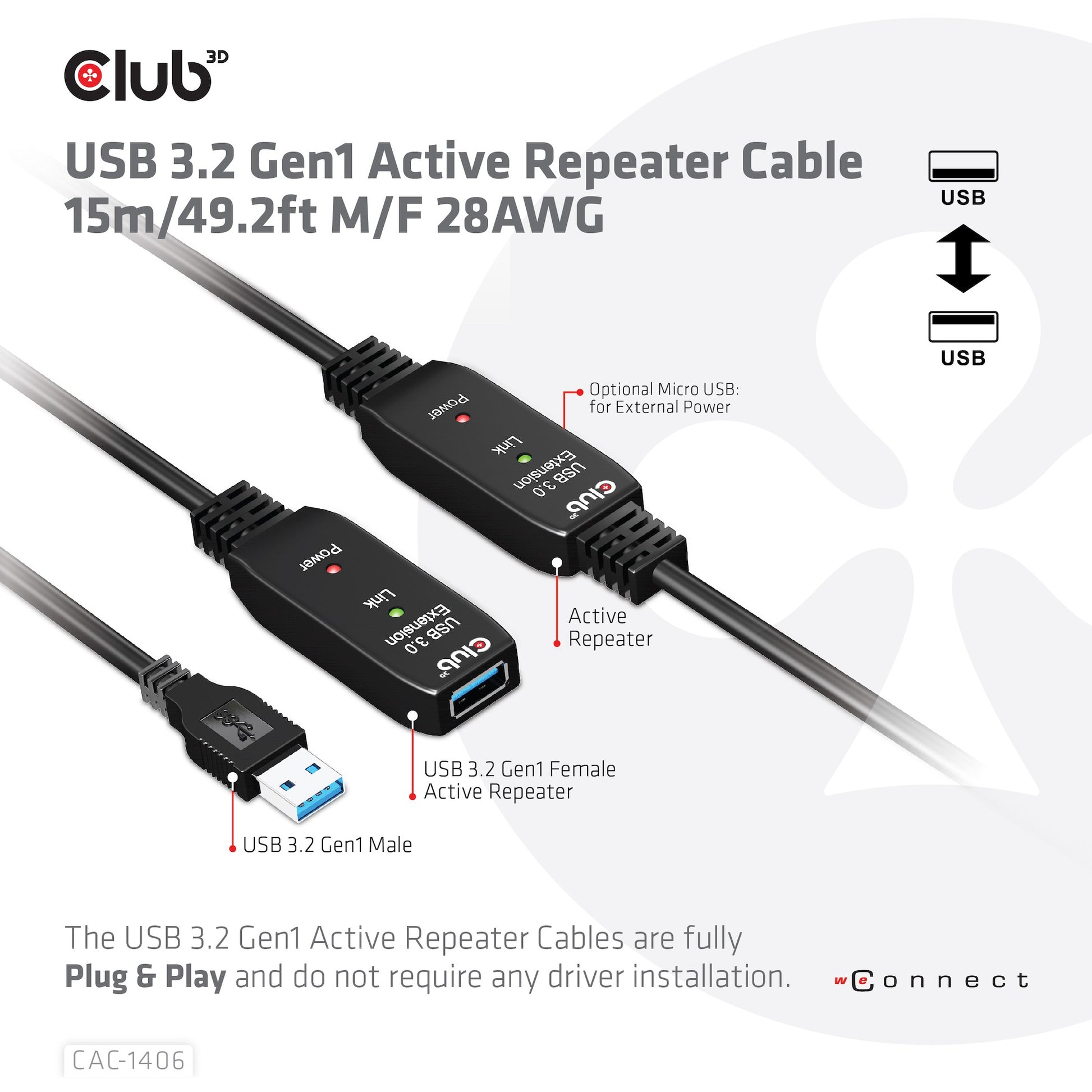 CLUB3D CAC-1406. Kabellänge: 15 m. Anschluss 1: USB A. Anschluss 2: USB A. USB-Version: USB 3.2 Gen 1 (3.1 Gen 1). Produktfarbe: Schwarz