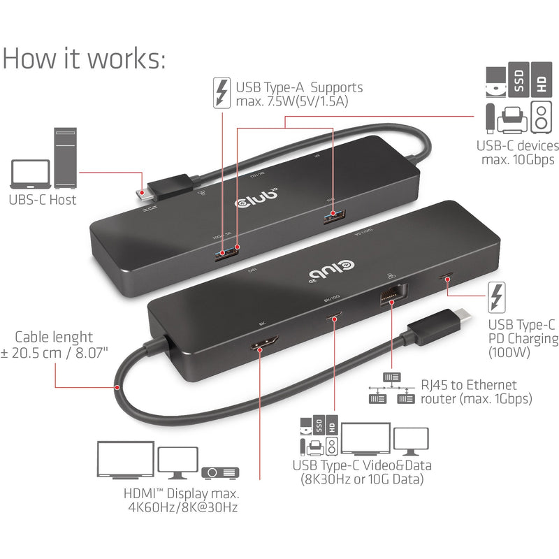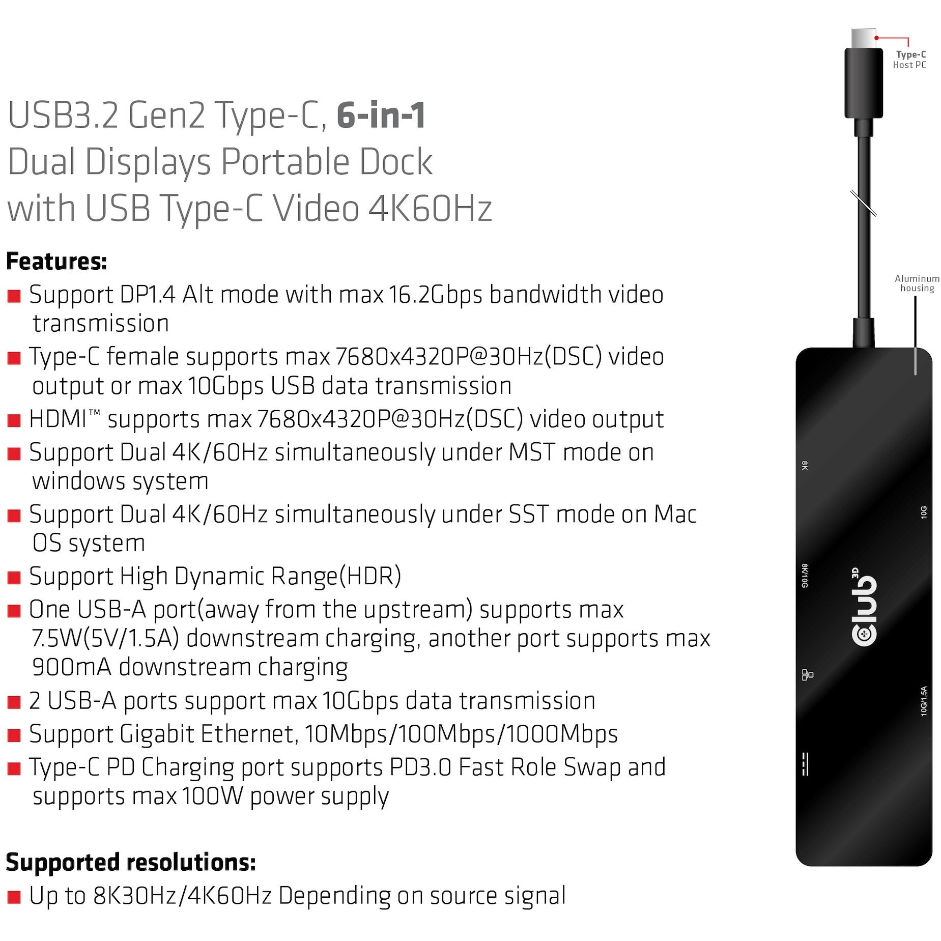 CLUB3D 6-in-1 USB3.2 Gen2 Typ-C Dual Displays Portable Dock mit USB Typ-C Video 4K60Hz. Übertragungstechnik: Kabelgebunden. Hostschnittstelle: USB 3.2 Gen 2 (3.1 Gen 2) Type-C. USB-Stromversorgung bis zu: 100 W. Ethernet LAN Datentransferraten: 1000 Mbit/s. Produktfarbe: Schwarz