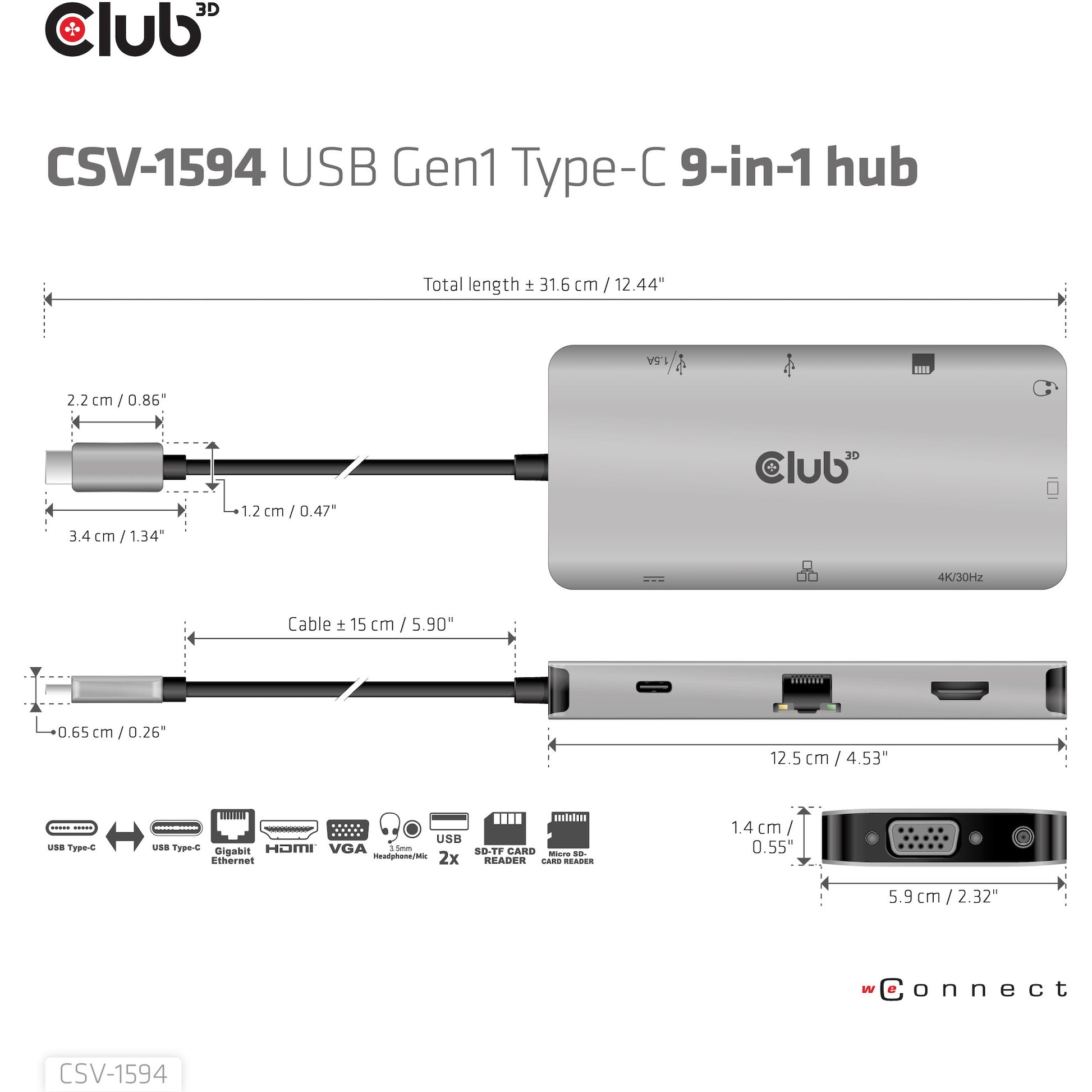 CLUB3D USB Gen1 Type-C 9-in-1 hub with HDMI. VGA. 2x USB Gen1 Type-A. RJ45. SD/Micro SD card slots and USB Gen1 Type-C Female port. Hostschnittstelle: USB 3.2 Gen 1 (3.1 Gen 1) Type-C. USB-Stromversorgung bis zu: 100 W. Ethernet LAN Datentransferraten: 10.100.1000 Mbit/s. Produktfarbe: Schwarz. Grau. Kompatible Speicherkarten: MicroSD (TransFlash). SD. Maximale Bildwiederholrate: 60 Hz. Ausgangsspannung: 5 V. Ausgangsstrom: 1.8 A. Stromverbrauch (max.): 7.5 W. Breite: 125 mm. Tiefe: 59 mm. Höhe: 14 mm