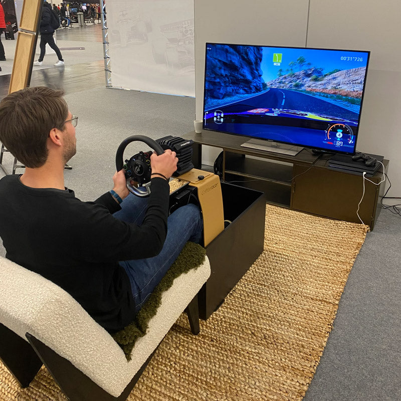 Kompaktes und leicht verstaubares Racing-Cockpit, zur Montage von Lenkrad und Pedalerie, ideal für die perfekte Rennsimulation, ergonomisch einstellbar, für Personen zwischen 120 - 210 cm Körpergröße, versteckbar in Form eines Möbelstücks
